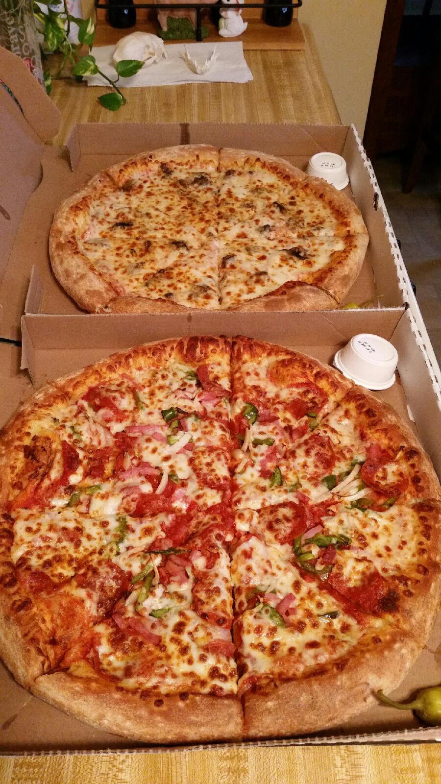 Read moreAs an honest review of the place, the pizza was good, the people there work decently enough, but honestly I had ordered three large pizzas, and they said it would be done in 25 to 30 minutes. I took their word for it. In 30 minutes I showed up to pick up the pizza. When I got there, they never even started making them yet. Granted they were very busy, but it took them 2 hours to finish my three large pizzas. I also made a mistake, because I didn't check the pizzas before I left when I got them. I expected when I ordered my three pizzas which were a bacon and onion pizza, a bacon chicken and ranch pizza, and a spinach pizza with no tomato, I got a bacon, chicken and ranch Pizza, a bacon and onion pizza, and a TOMATO Alfredo pizza; the opposite of what I asked for.