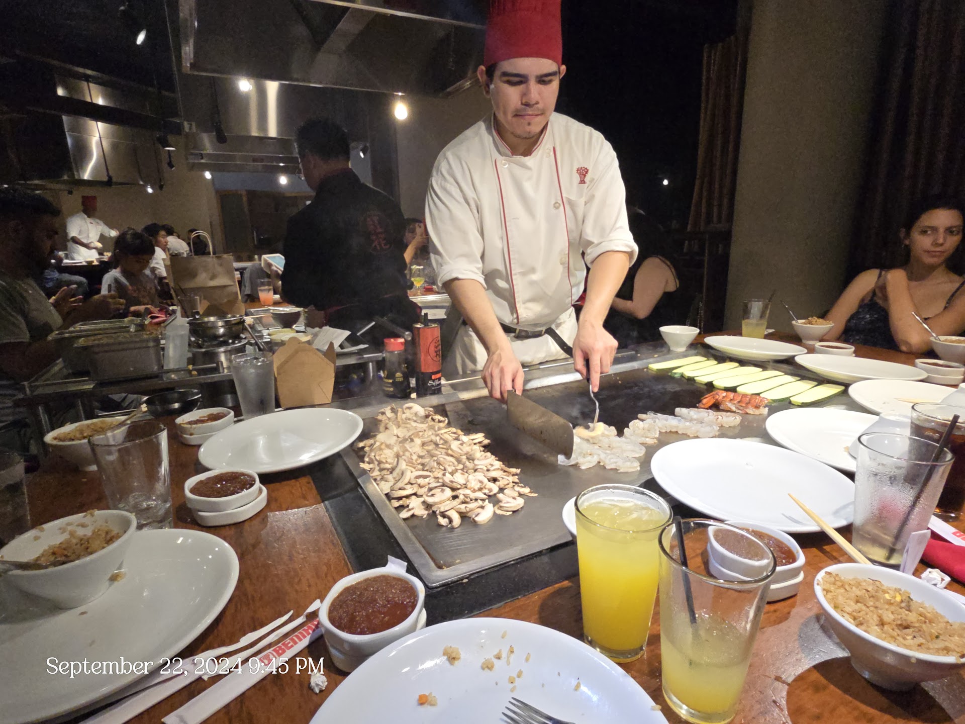 Having come to Benihana countless times, we kind of knew what to expect. Our chef did everything we expected to do but simply 10 times worse. The chef started with a "show" which included of spinning the meat fork and occasionally dropping her other utensils on accident. Keep in mind everyone at the table had waited over 2 hours and were not in the mood to see the chef dropping cooking utensils all over the place, instead of cooking the food.