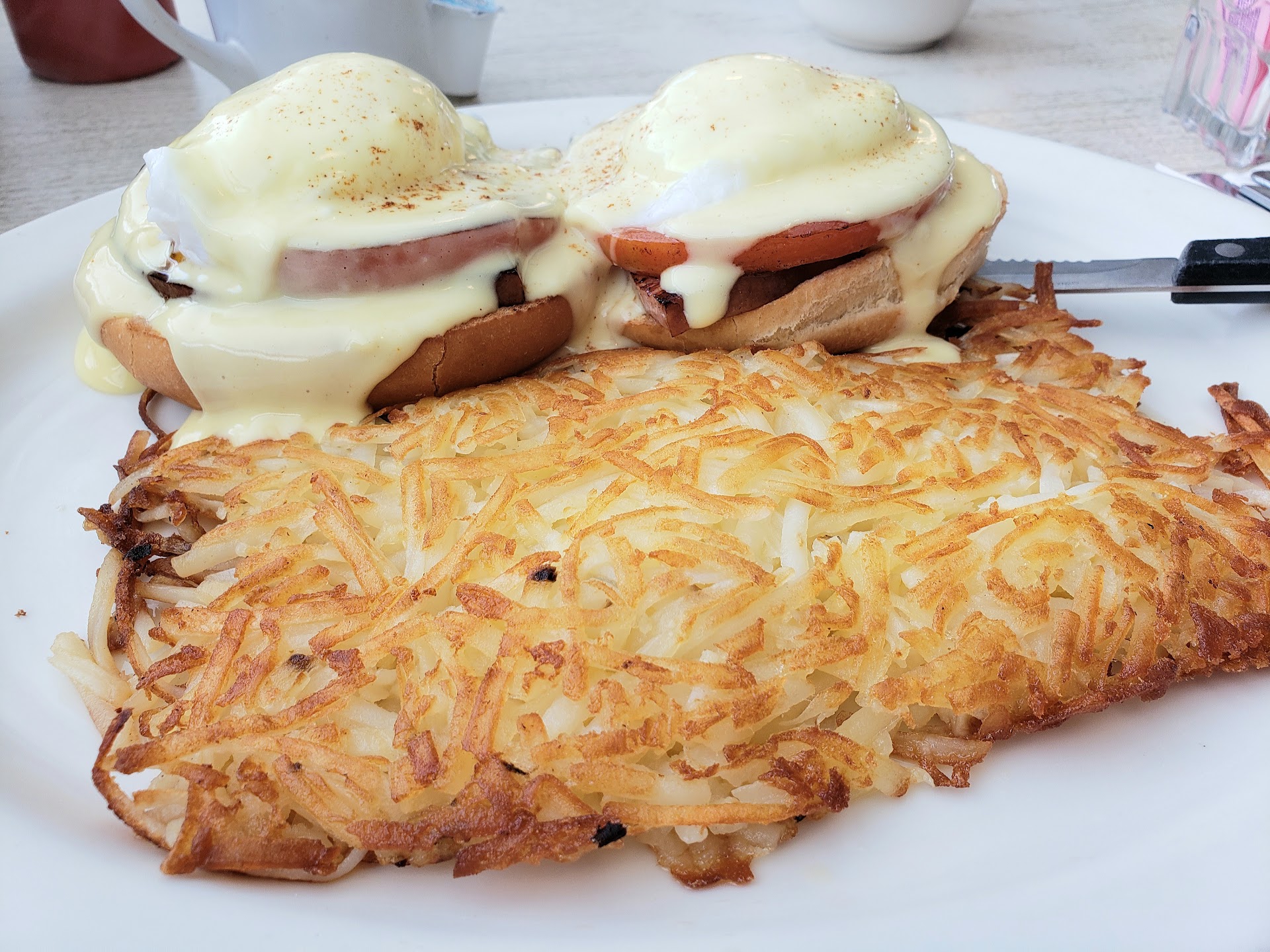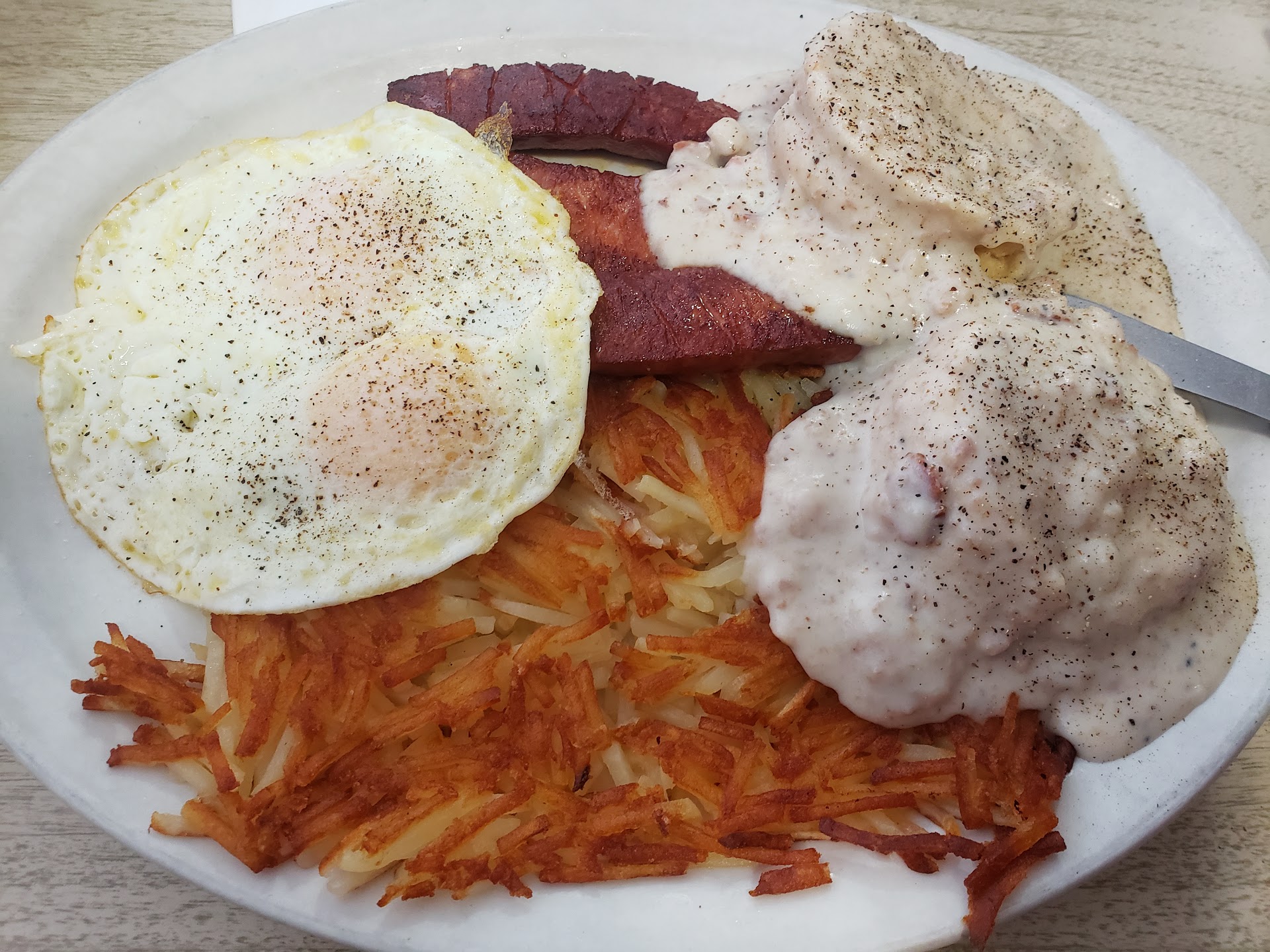 Wow.. I don't get it. Either people here have no idea how this type of food is supposed to taste or somehow we got junk served to us. Wife ordered a simple plate of bacon and eggs. Bacon strips are way overcooked they're more like bacon chips. I ordered chicken fried steak with gravy. Description said gravy made with sweet milk. It should be more like sugar. The consistency of gravy is not as thick as it should be. Other than the sweetness, which is too much, there's no flavor to the gravy at all. I've had better gravy from KFC. And the steak itself is also way overcooked. It is very chewy. I can't even easily cut it with a steak knife. And it is blend. Hashbrown is also blend, and in its case, undercooked. I don't like my hashbrown crunchy but soft soggy hashbrown? The only thing that is decent on my plate are the over easy eggs. Thank God they at least know how to cook eggs over easy. And then the service... Our waiter had no personality. We greeted him with hi, how are you, and his reply is "are you ready to order?" He has no expressions on his face. The entire experience is just blah. Bad food + bad service = how the F do they have 4 stars? Seriously, any Waffle House from the South beats this place. I gave it 2 stars before I started writing the review. Now I think it...