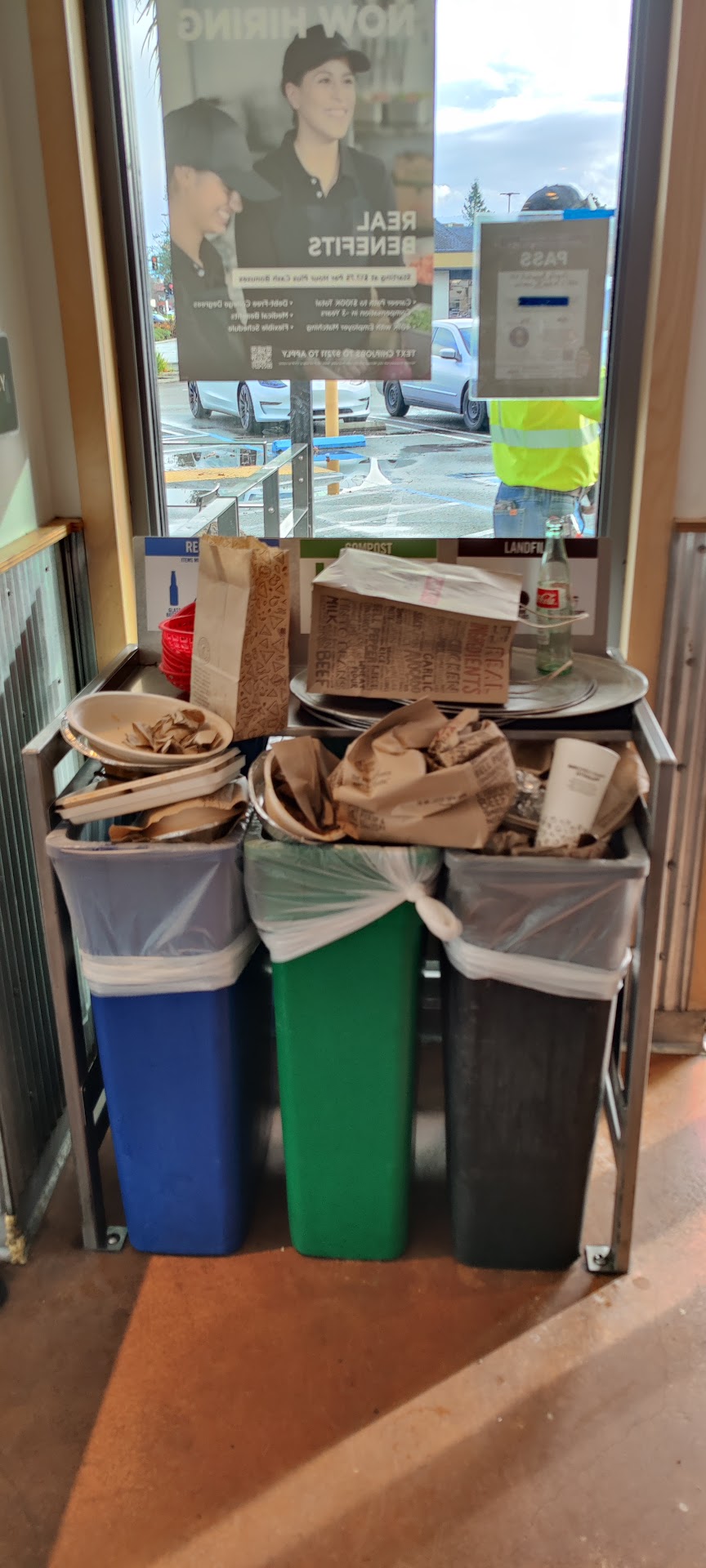 They have a habit of taking out all the garbage cans around 9 pm. So as soon as you through away your food waste, it all lands on the floor on all 3 bins.