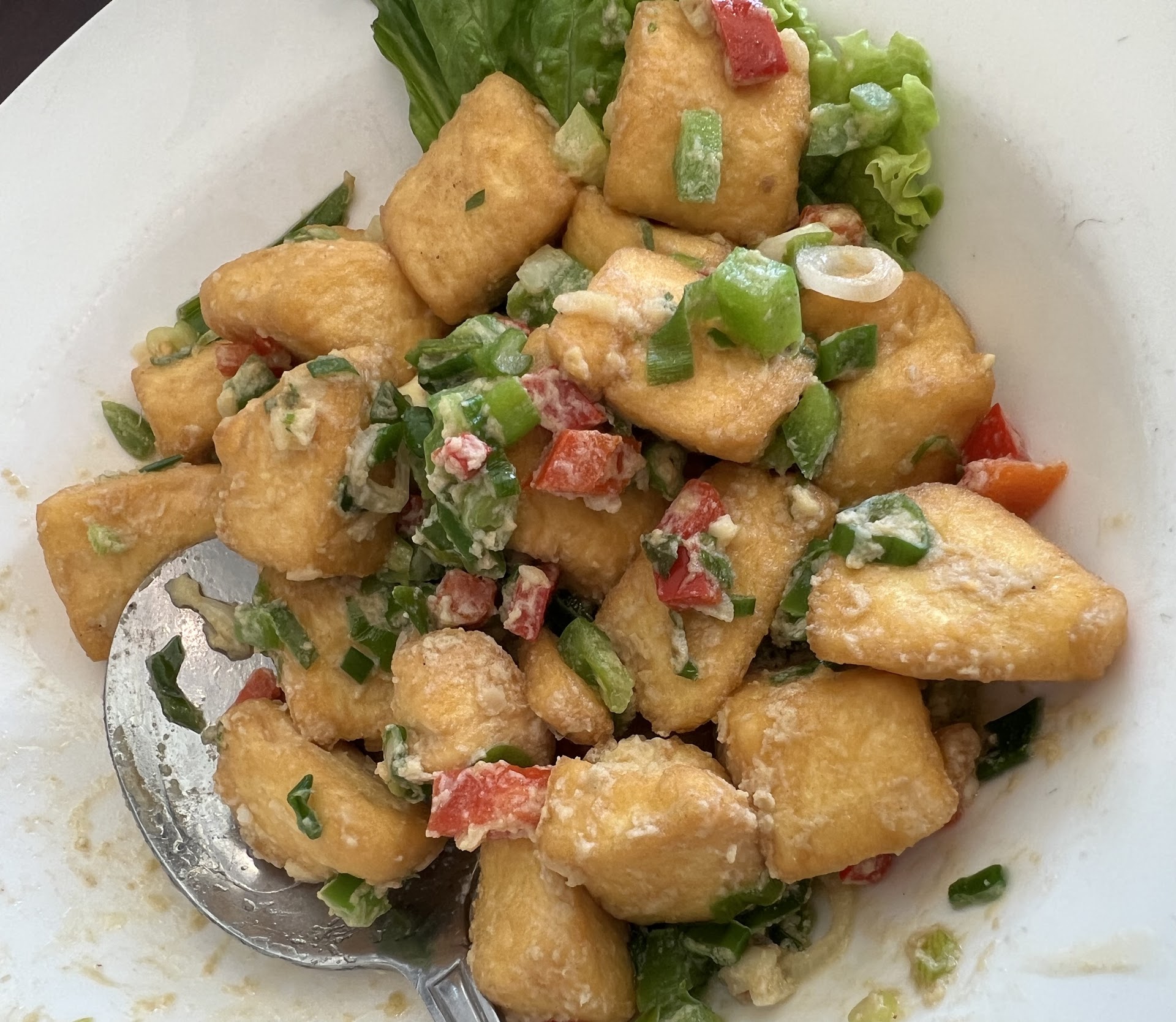 However, the pork and crab dumplings we did try were tasty, but the recommended fish dumplings had thick skin, and the egg yolk tofu didn't live up to the hype. The pea sprouts were good.