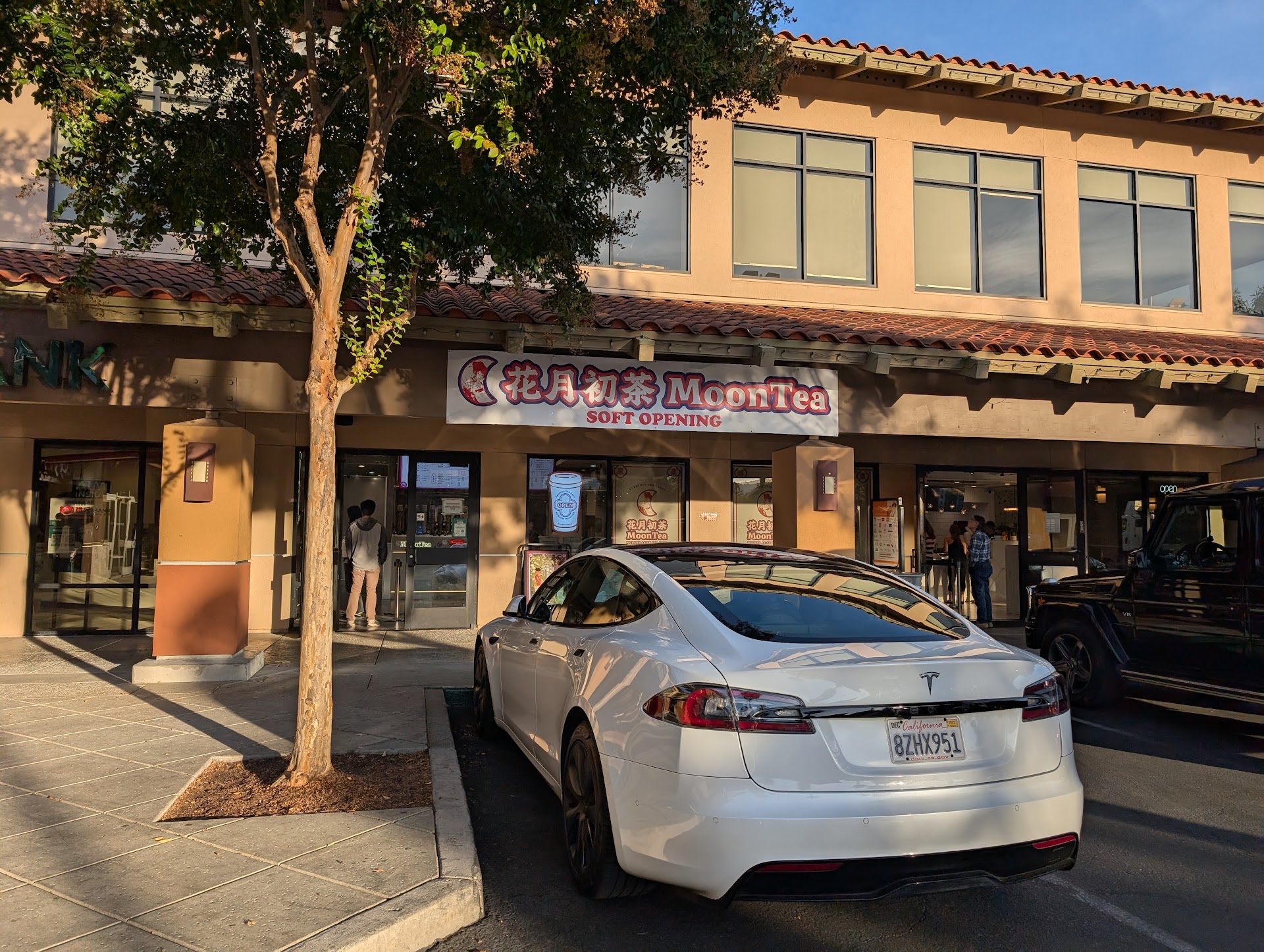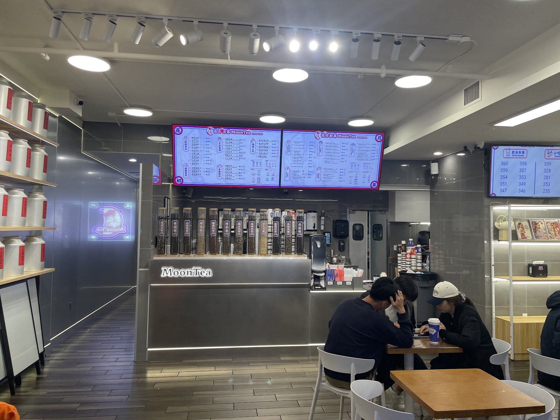 Moon Tea is a small but popular boba shop located in a bustling plaza with many other restaurants and stores. Due to its prime location, the parking lot is often packed, making it difficult to find a spot during peak hours. Inside, ordering is done through a single self-service kiosk, which can lead to long wait times, especially when thereâs a line of customers.
