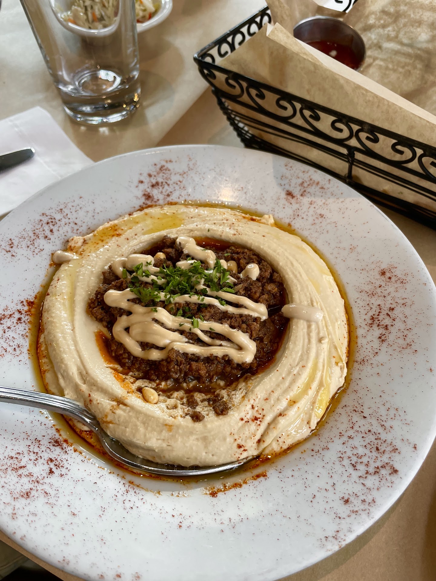 I was impressed with the waitstaff, so attentive. Beautiful inside but my mom does not like Air conditioning so we sat outside. Introduction was a little confusing. Although full of enthusiasm, I think Dad just need to look at menu. The Pita was very good. Dad wanted to try Mediterranean food? Im not sure I like Hummus. Maybe because I was not too hungry. This restaurant is very good for Vegetarian. My Dad's Hummus with Chicken was good. The Hummus taste light ( which i like) with slight touch of Tahini. I guess I just dont like Tahini? I probably should have tried the Kale Chickpea Salad. Waitress recommend the Variety Plate for 18 dollars. It sound good Eggplant ( Babaganoush), Beets,Carrot, & hummus?? & Strained yogurt Cheese. It sound so healthy but I was just not in mood for Eggplant today. My Dad's Hummus Chicken had little Chicken in it. Although very delicious Chicken, I kind of wish they put more Chicken in it. Since I was not hungry i tried the Muhammara? It is a Walnut, Crushed into a paste with Pomegranate. It sounds real good but Im not sure I like it. It came with Pita Chips. It would be a little better if the Pita Chips were lighter. They were almost hard like? The Pita Dad got were delicious but the Pita Chips were more hearty. I just dont think the Chips were good. If they had a thinner Pita ( for chips)...it would be better. Eating Pita chips should have a light crispy texture. If they used thin Pita for the chips it would have been good? Another table ordered Drinks which looked delicious, but since my Mom has digestion issues and has a tendency to drink cold drinks & then get sick we only ordered Hot Mint Tea. The Mint was very good. I have a feeling the meat ( or skewers) are very good ( maybe next time if Im hungry). I should try the Shakshuka or Eggs with either Turkey Sausage ( but I think they were out of regular Shakshuka) so we would have gotten the Kale, Spinach one. Like I said, this place seems really good for Vegetarians. They just need to make the Pita Chips lighter ( like chips) then they would sell the Fattoush salad like crazy. I dont remember seeing any lettuce on menu ( Dad ordered Cucumber,Tomato salad). If this place had a lettuce Crispy Salad with light PIta Chips ( Fattoush) then the combo of a Crispy Lettuce type salad with the Crispy chips would be...
