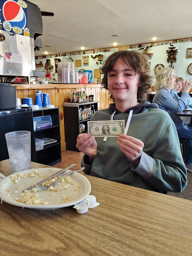 Our waitress had a little fun with my 13 year old son when he ordered the short stack of pancakes, which includes two cakes. She suggested he just have one pancake, but he was adamant he wanted two, so she made a bet with him: if he could eat BOTH of the (huge) pancakes, she'd give him a dollar, but if he couldn't eat everything, my son would owe her 10 push-ups. She said she's made this bet before and has paid out the $1 only once in the past. Our son made it twice, to her (and our) amazement, because the cakes really were HUGE.
