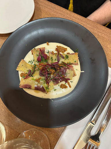 Read moreWe made reservations over a month in advance, so be patient trying to eat there. We had a table of 6, so we all tried some delicious food, including a secret (appetizer) menu item that you have to ask for. I will add tons of pics for review. I ordered the beef tartare tacos, filet mignon, and au gratin potatoes. I have ordered my steaks the same way for years. (Medium Rare, but more rare than medium). The beef tartare was very well seasoned and had a great presentation. This is where things kind of turn average. My filet was super tender but was way overcooked. Half of the steak was pretty medium rare, but the other half was definitely medium (highly disappointed). The potatoe au gratin was average to sub-par. The potatoes seemed very dry and lacked seasoning. All 3 people that had the filet agreed the potatoes were just average and lacked seasoning (salt). In my opinion, the potatoes were definitely overlooked and could have been better. The lobster steam rolls were good but nothing special. The Beet & Brown Butter Raviolis were absolutely amazing (I would highly recommend them). The Rabbit Leg, Duck Confit, and King Salmon tasted good and were presented well. However, all the dishes seemed to lack finish seasoning. The waitress Destiny was amazing, friendly, and even joked and engaged with us very well! I did wait a while to get a refill on water, but she kept the wine and beer flowing to several members at our party. I enjoyed an americano coffee but I was half done when the side of cream was served.