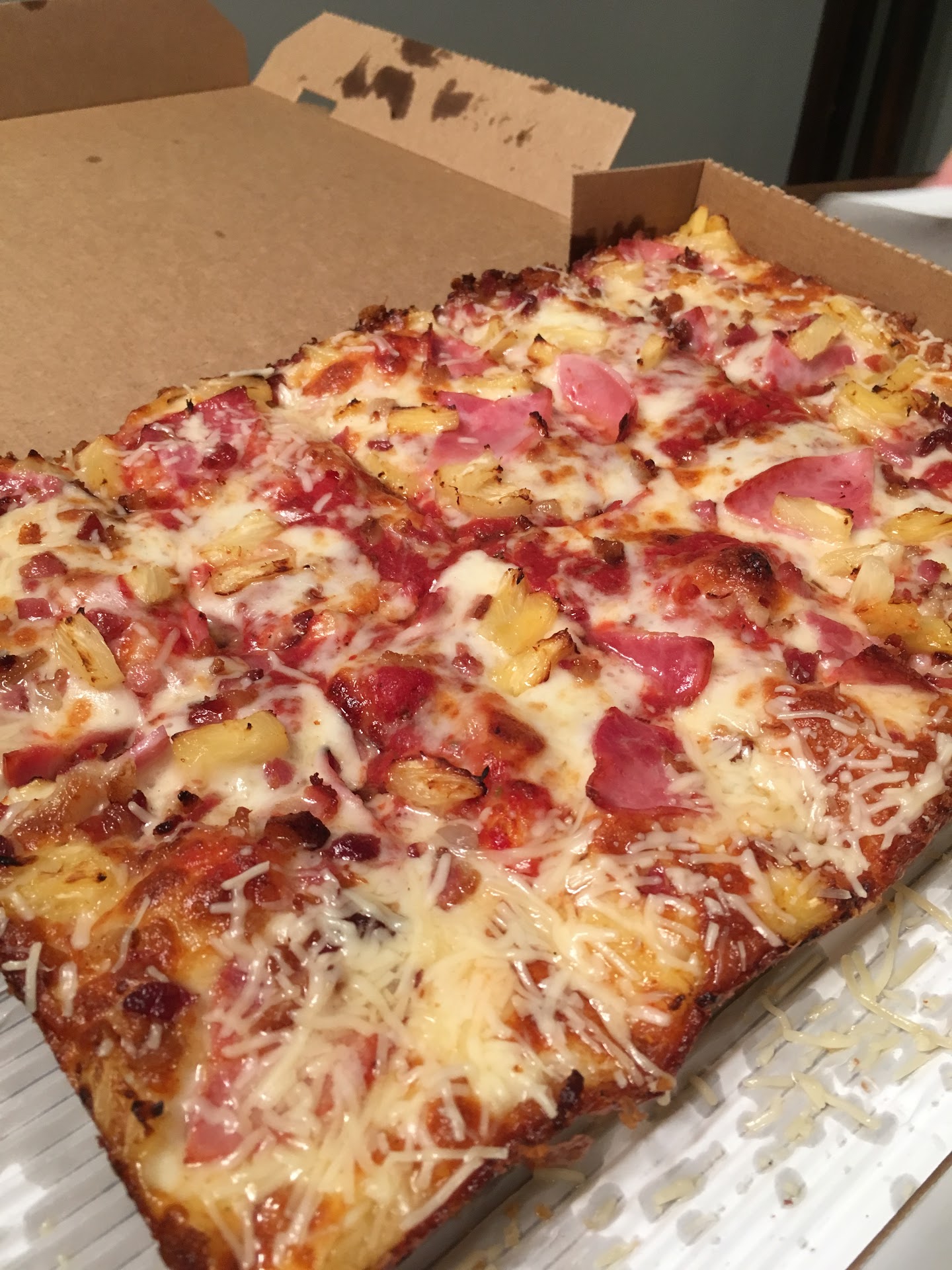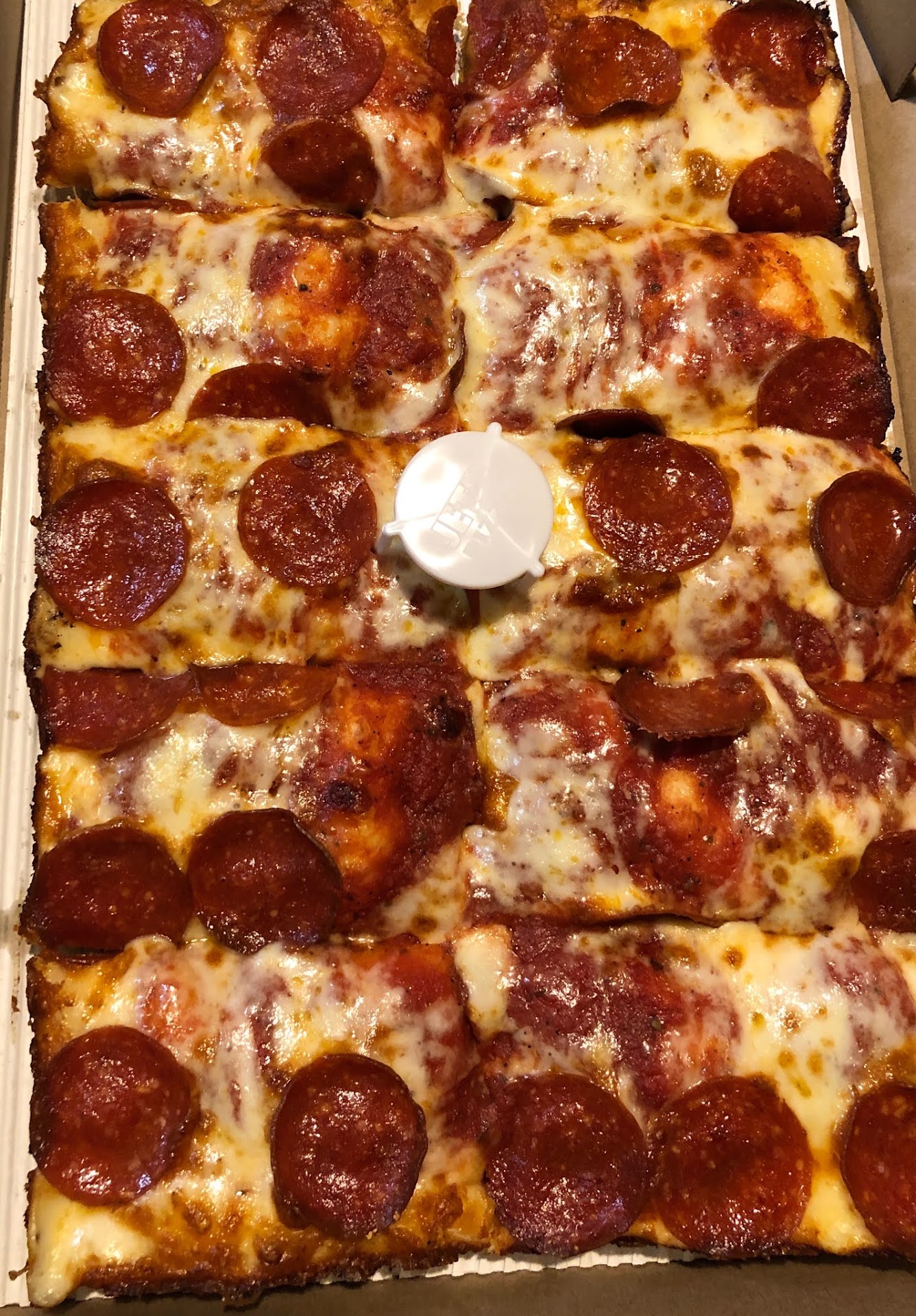 Jet's Pizza specializes in the "Detroit Style" deep dish pizza which is a thick crust in a square pan. Reminiscent of the quick serve lunch lines back in the early 20th century when Detroit was booming when they'd serve you a square piece.