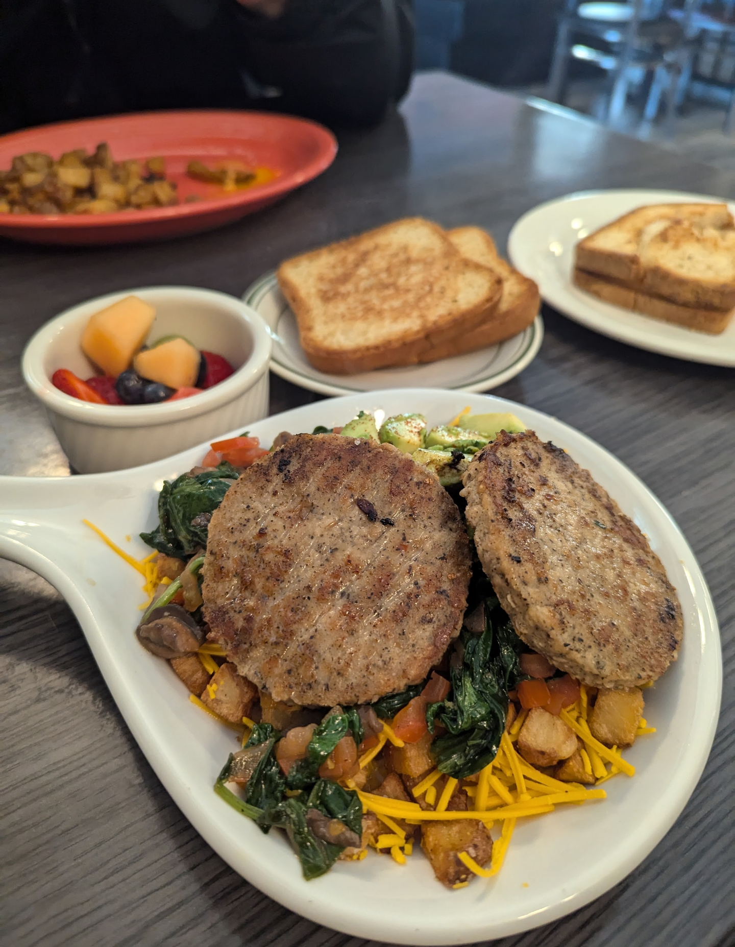 My daughter got the brunch burger but we asked for the vegetarian option. They put what looked like real bacon on it. We asked for American cheese, but the burger came out without it. I didn't ask about this though, as my kids was hungry. We asked for the egg to be scrambled and on the side (again, a nice accommodation). The scrambled egg wasnt soft or fluffy. It was kind of solidified and chunks could be cut off with a knife. My daughter loved the potatoes.