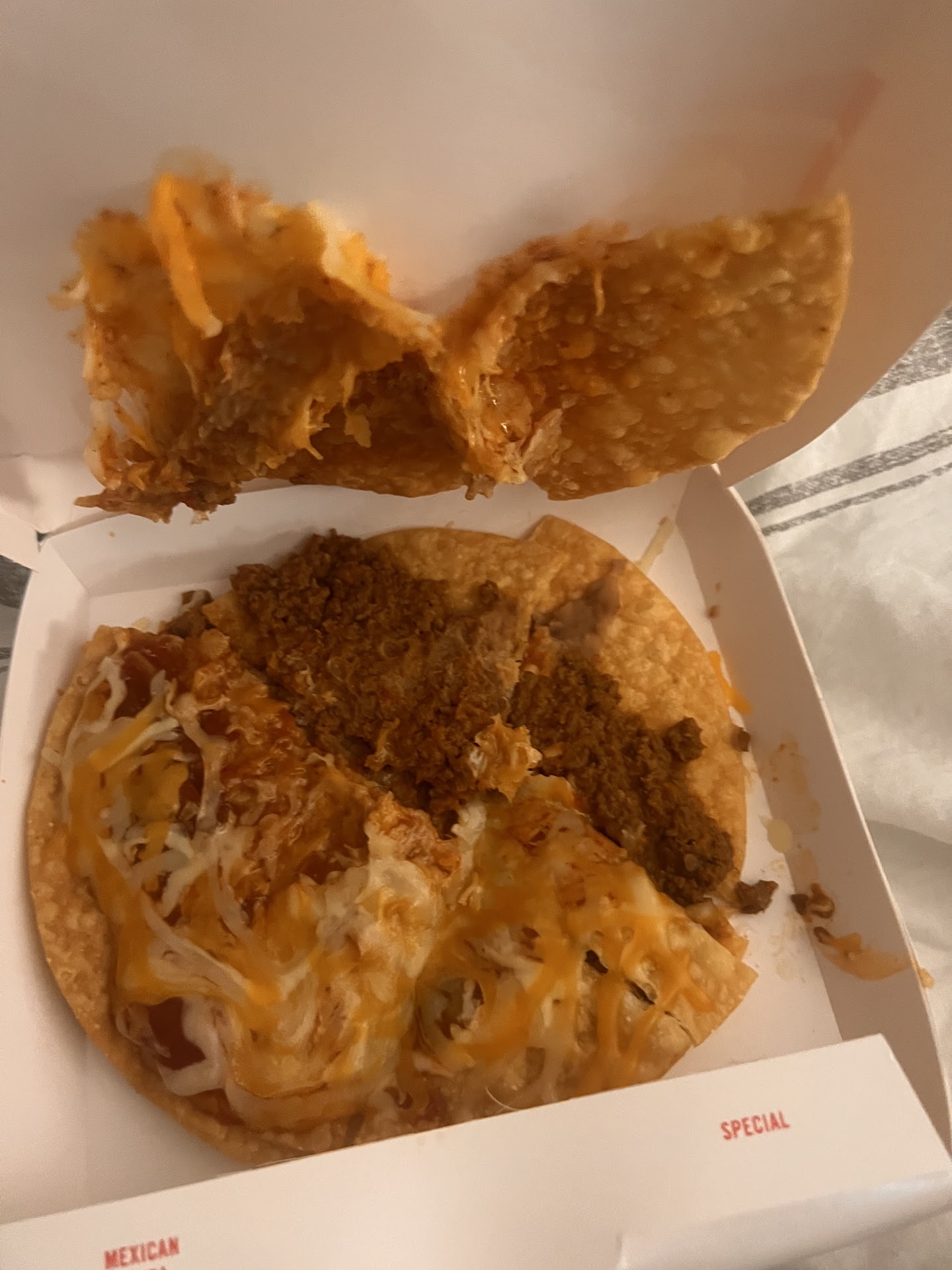 When we arrived home to eat the food, it was evident it had been prepared with little care. Despite costing 4 or 5 dollars, the grilled cheese burrito was only about 4 inches long and 2.5 inches wide. It weighed maybe 6 ounces. We also ordered a cheesy bean and rice burrito which was small but cheap, so that was ok. Much more disappointing was the order of 2 supreme chalupas. The contents were fine, but the shells were stale and thin, lacking the usual crunchy, tender fluffiness that makes a chalupa delicious. It was a miserable disappointment since this was ordered for my wife who thought it was disgusting, but wanted to try Taco Bell again to determine if it was as good as I said. Needless to say, I proved nothing and Taco Bell lost a new customer.