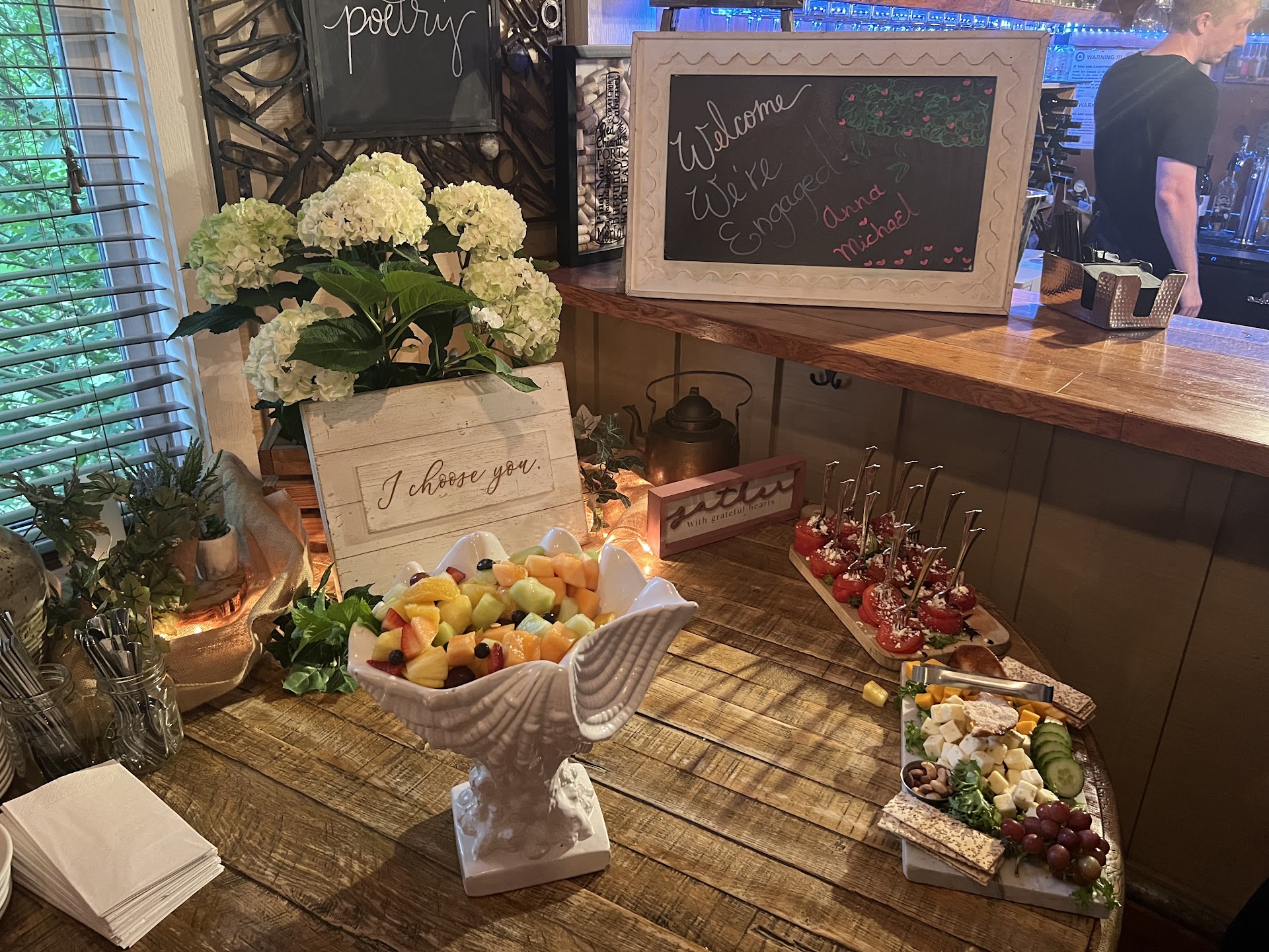 Plenty of on-site parking Cute sign (outside) announcing the engagement, which was surrounded by fall decor (pumpkins, mums, etc.) Lovely centerpieces Musician - Steve Howell - such a nice surprise and really added to the atmosphere of the event 60 plus attendees who could mingle on the main floor, upstairs, and even outside in the evening since the weather on Oct 19 was spectacular We did not expect attendees to bring gifts but ended up needing space for them. Jesse was so accommodating to make the space for these. Amazing food selection which was prepared by Christopher and his team - he is a talented chef!