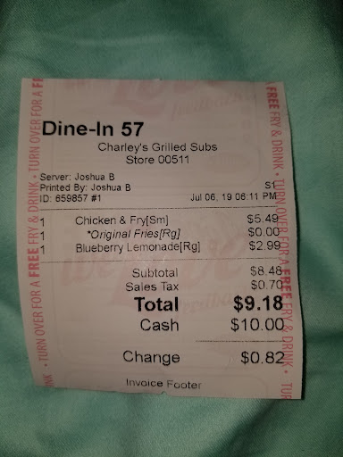 Read moreDo yourself a favor and avoid this Charlys location at all cost. Me, my wife and daughter went there an hour before they closed and requested all flats well done like we do with the Wingstop, Wingzone and all other Charleys locations weâve visited and the âmanager on dutyâ told us they donât HAVE ANY flats but all drums, which we thought we was ridiculous and we told them so. Once we pulled up and told them in disbelief how that makes no sense the MOD âpersonâ closed the window on us in the drive through and refused us service. I went in and requested the GM/Owner information and had several people tell me they were the manager. To say the least I was extremely upset and told them to do a better job and we wonât ever do business there again. The âpersonâ was rude, condescending, poor communication skills and a flat out embarrassment to anything I think the people who started this company would want to...