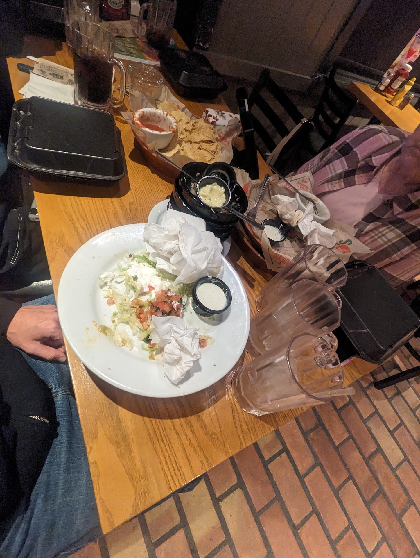 Read moreThis place has kind of turned into a hot mess. There was a wait to be seated, which was fine and understandable. It's a Saturday night, most restaurants are busy. We got seated (5 or us) at a table that seats 4 max. Again, not that big of an issue. Ordered drinks and the server / runner who brought them out had the personality of a brick. Didn't tell us which drinks were which and just stood there like a sack of rocks and handed extended his hand like Frankensteins Monster or something. He was one drink short. Didn't say anything like, "I'm going to get that last drink". When asked about which drink was which ( coke vs Dr Pepper) he just turned and literally walked away. Eventually he brought the last drink... Again Capt personality just handed it to me and walked away. I can kinda get it if he's a runner vs a server. No issue. We ordered salads and such. They were good. Kinda hard to mess up a salad. But when the main course comes, all the empty salad bowls and drink cups were still on the table. And we were dealing with limited room to begin with. The server came by, nice enough guy, but we mentioned about the lack of space to eat, and he just looked and said ok and walked away. Come on guy, you had to make room on the table, due to all the empty cups and bowls, to put our refill cups. Why not just buss the table a little. Food was good, no real complaints. But they screwed up the bill pretty significantly. And I was trying to pay with the stupid little table tablet thing but had to stack all the bowls and cups and plates in order to even be able to pay the bill... So we stacked all the stuff at the end of the table so we could put our stuff in the to go boxes. I even took a pic of the pile at the end.
