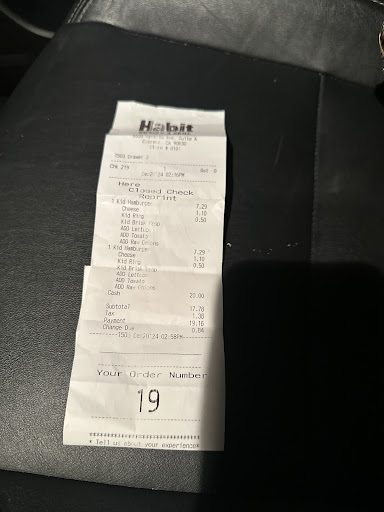Read moreI like the food here. However, it seems to me that at The Habit, cleaning the trays they serve the food in is not in their policy. My tray at this location was again covered in grease and crumbs from the last customer to use it. Even a piece of lettuce was stuck to it in plain sight, dried to the tray, so i know it didn't come from my fresh food. The bathrooms at this one were being cleaned when i was there, and weren't even finished by the time i was ready to wash my hands and leave. There was soapy water all over the floor and just left like that. I needed to use the facility but decided not to since the door was propped open. Another thing, why do the bathrooms at these places always smell as if someone had just smoked inside? Can't your employees go outside to enjoy their smoking? Or who was it? You need to really work on this Habit. Very...