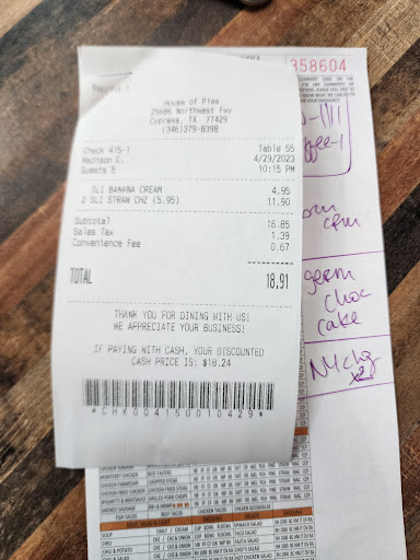 Read moreI hate to give a bad review but I do not recommend this location. My daughter and I had lunch here for the first time and we were both highly disappointed. First of all, there are two seperate doors on the right side of the building, opposite the drive through, that seem to be the entrace but are both locked. You do not know this until you walk up and try to open them. You then stand there and look confused because there are no signs to tell you where to enter, so you walk around the entire building, towards the drive through, and there it is - entrance. The prices are also high for mediocre food quality. My daughter ordered the chicken fried chicken lunch plate for $16.95 and the chicken was very thin and dry. The corn was also a strange chewy texture with zero flavor. I ordered a baked potato with the works minus bacon and a side salad with a roll. While I was on my second bite of potato, I noticed that there was bacon around it. It was as if they put it on, then noticed that they made a mistake and tried to remove it. I do not eat bacon so that completely grossed me out. I kindly asked the waitress to take it back along with the dry roll. She apologized and asked if I would like to order something else but I didn't have the time to spare. They still charged me for the side salad, that I only took a few bites from due to my disappointment. In otherwards, I was charged a little over $4 for aggravation and disappointment all while leaving there hungry. I have previously heard high reviews of The House of Pies so I've been wanting to try it. They must have been talking about the original location because again, highly disappointed. I am sure that the original location is a lot better due to the pride they take in it. I will say that this location did have good, friendly service. I also have tried their strawberry cheescake at an office event and it was...