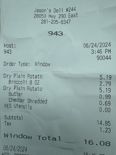 Read moreLet me start by saying this location and the morning crew deserve 10 stars! I've been on a liquid fasting diet for almost 15 months. I eat about 1 cup of solid food a WEEK. I've lost 90lbs but it's gotten harder to just be full on 1 smoothie a day. This location opens at 7am and I got there at 8am and saw the sign about breakfast only in the drive-thru and just knew the door would be locked. The door was unlocked and the drive- thru person was so friendly! He said I couldn't get a salad until 10am (same time I start work). I was crushed since I was so excited about food. The mgr (?) saw us and heard I wanted the salad bar. He said it was OK for me to get my salad once the super nice lady finished setting it up - and she was so quick! I waited maybe 3 mins for her to finish. EVERYTHING on the salad bar was fresh and delicious. I was sooo happy since that salad was what I was going to eat for the next 3 days. This location is very clean, food is fresh, morning crew were all nice and friendly and you could see they have a higher standard at this location than a lot of other Jason's Deli locations. Choose this location and you won't be disappointed but will leave full, happy and satisfied. They will see me at least once...