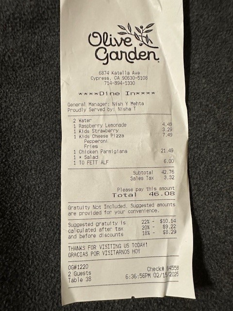 Read moreOlive Garden 1220 6874 Katella Ave Cypress, CA 90630-5108 Check #62882 19:30:30 08/08/2017