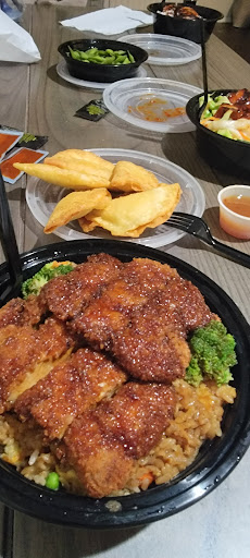 I placed a to go order and we had 3 regular size bowls, one chicken teriyaki with steamed rice, one spicy chicken teriyaki fully loaded, and one chicken katsu fully loaded. We also got the edamame and crab Rangoon.