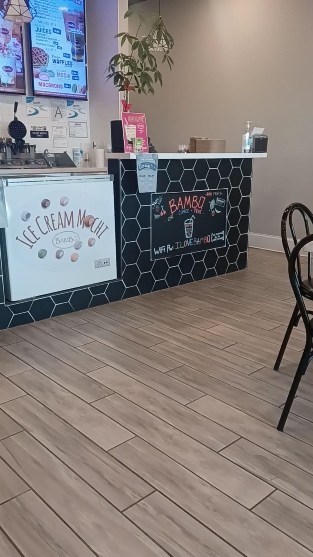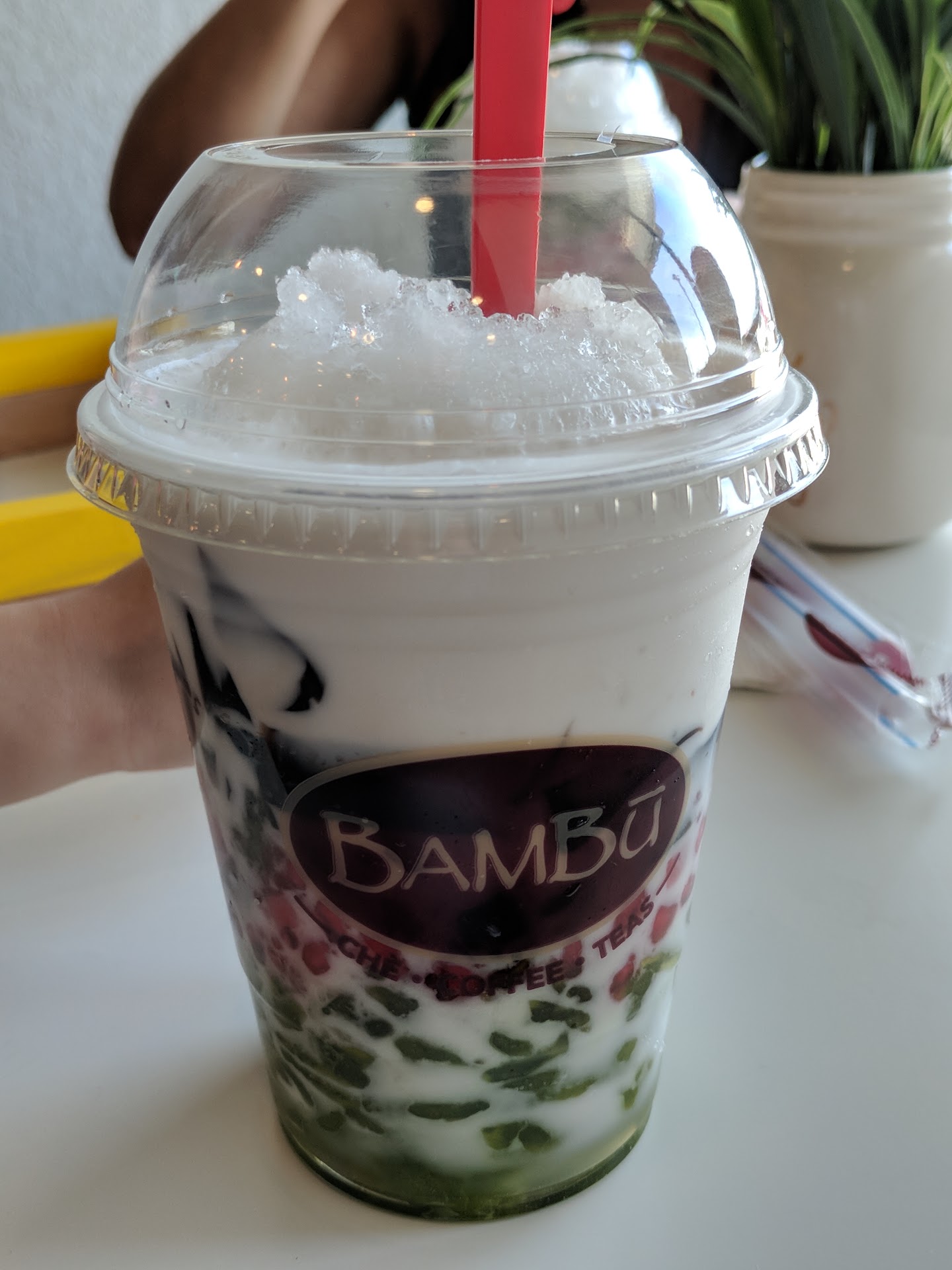 Tried this place as a treat today. You walk in. It's warm. Smells wonderful. Like a coffee shop, but not as INTENSE. Gotta say the atmosphere is very chic with a dash of cutise. Upbeat music playing. You're greeted upon entering. They have a large variety of drinks and all kinds of add ins and toppings. Very clean and clear menu. No scribbled in options or papers taped to it. I think menu items displayed on white canvas was a super classy advertisement idea. My friend went for the taro milk tea with Boba and I got a strawberry smoothie. They were both really good! But I have to say my smoothie was so FRESH tasting! Not a "pull the lever for an instant smoothie mixture" gas station/movie theatre type drink for sure. The plants on the tables are fake but ridiculously clean (as in no messy fingerprints or spills on them.) Instead of waiting in line for starbucks...try Bambu for your next "treat day" or pick me up. They have plenty of coffee drinks too! Also looks like a fun spot to hang out or meet up...