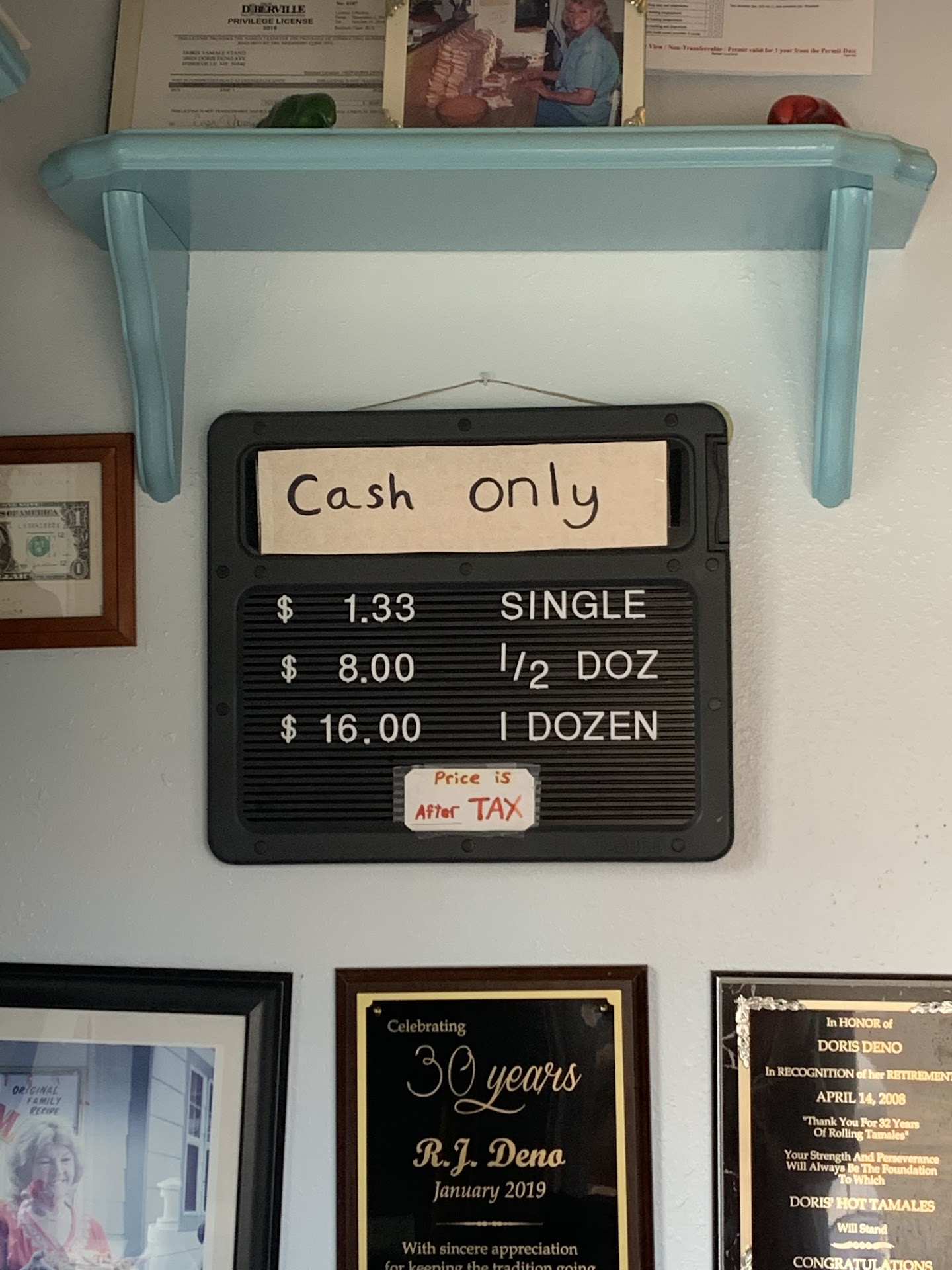 Few years ago I was driving wrecker for my brother D & D towing & recovery throw little sum in sum in for my brother but I saw this place n I stopped cause I love a good home made hot tamale but I saw picture of Doris n back in early 90's that Mrs Doris drove to Gulfport every Friday I worked at Deas tire company now Delta world on 25th Ave downtown Gulfport I questioned employee there turn out be her daughter sh said her mom had passed but she kept it going using same everything n justike I remembered they are really really good so just so everybody know u want hot tamales that are like awesome n made right there I give it the biggest thumbs up like for real people try it I'm sure u will agree I live in Gulfport don't drive wrecker no more don't get over there lot but when I do I go get my dozen to go try save some for home but they never make it they disappear somehow anyway I highly recommend u try them they are the bomb I went by there other day all way Biloxi I was I got stop get my tamales n it was Monday that sucked cause they were closed haven't had time go back yet but I'm going one day this week get my tamale fix been on my mind...
