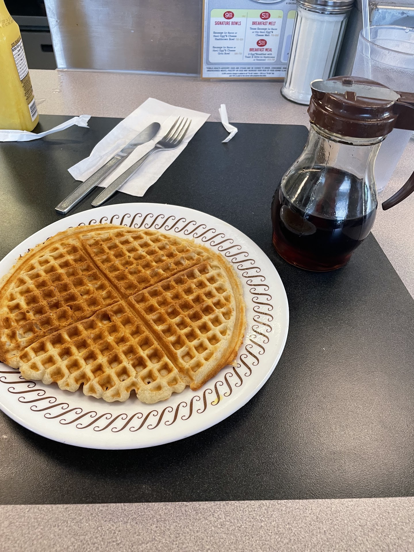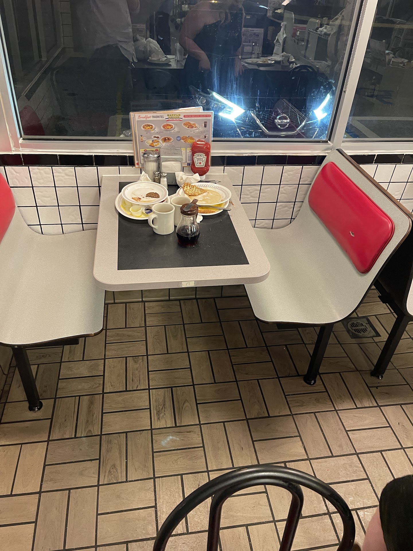 Thank goodness for the guests around to distract from the chaos and absolutely terrible service. Poor man next to me was already there when we arrived. He had ordered 3 biscuits to go. 30 minutes later we finally got our order and he was still waiting. And the server kept making comments about how she had to go in order, then had the nerve to tell him he should have ordered online and it would have been ready! The servers were talking about some shirts they were ordering for the team instead of calling orders and making excuses to the customers about why they couldn't call the orders. They had two and three orders per server waiting to go in. 10 minutes just to get water. We stop at Waffle Houses all over the country because they are efficient, consistent and congenial. This team was none of these and our server made both the guests and her teammates stressed and made us feel guilty for having asked if our order was in yet after 15...