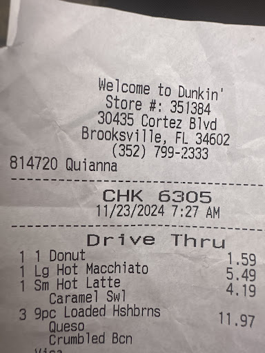 Read moreI am at Dunkin’ Donuts three or four times a week at the location on Broad Street in Brooksville. When I travel and have to get on 75, I will go to the one closest to 75 in Brooksville. This morning I stopped at the 75 location.