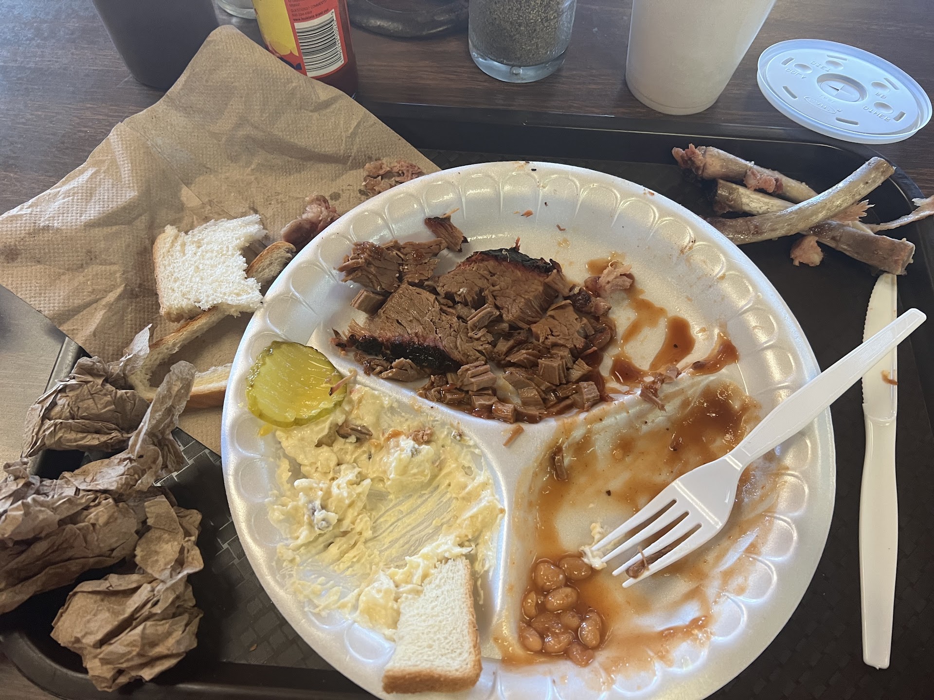 This was a nice family owned bbq place. The workers were extremely friendly. I ordered a chopped sandwich with a side of potato salad, and I thought the potato salad was very good. The sandwich had so much meat on it that I took part of it home and had another sandwich the next day. My husband ordered a two meat plate Ribs & Brisket with a baked potato. The ribs were excellent. The brisket was decent. The barbecue sauce had a good flavor to it. We didn’t get a detailed receipt for the order, which was our mistake because I believe that we were overcharged. My husband asked if he could substitute the baked potato for the two sides for an additional charge, but we believe that they charged us for the two meat plate and charged for a baked potato or they weighed the meat and charged us up per pound, and then charged us for a baked potato. Either way I felt that it was a bit pricey. The bill came to about $43 for the two of us for lunch which didn’t seem right I asked for a receipt, but it wasn’t detailed. It was just a credit card receipt. We talked about it at the table and decided to just let it go. But shame on us we should have asked how they got to $43, next time I would definitely want an itemized receipt on what we were...