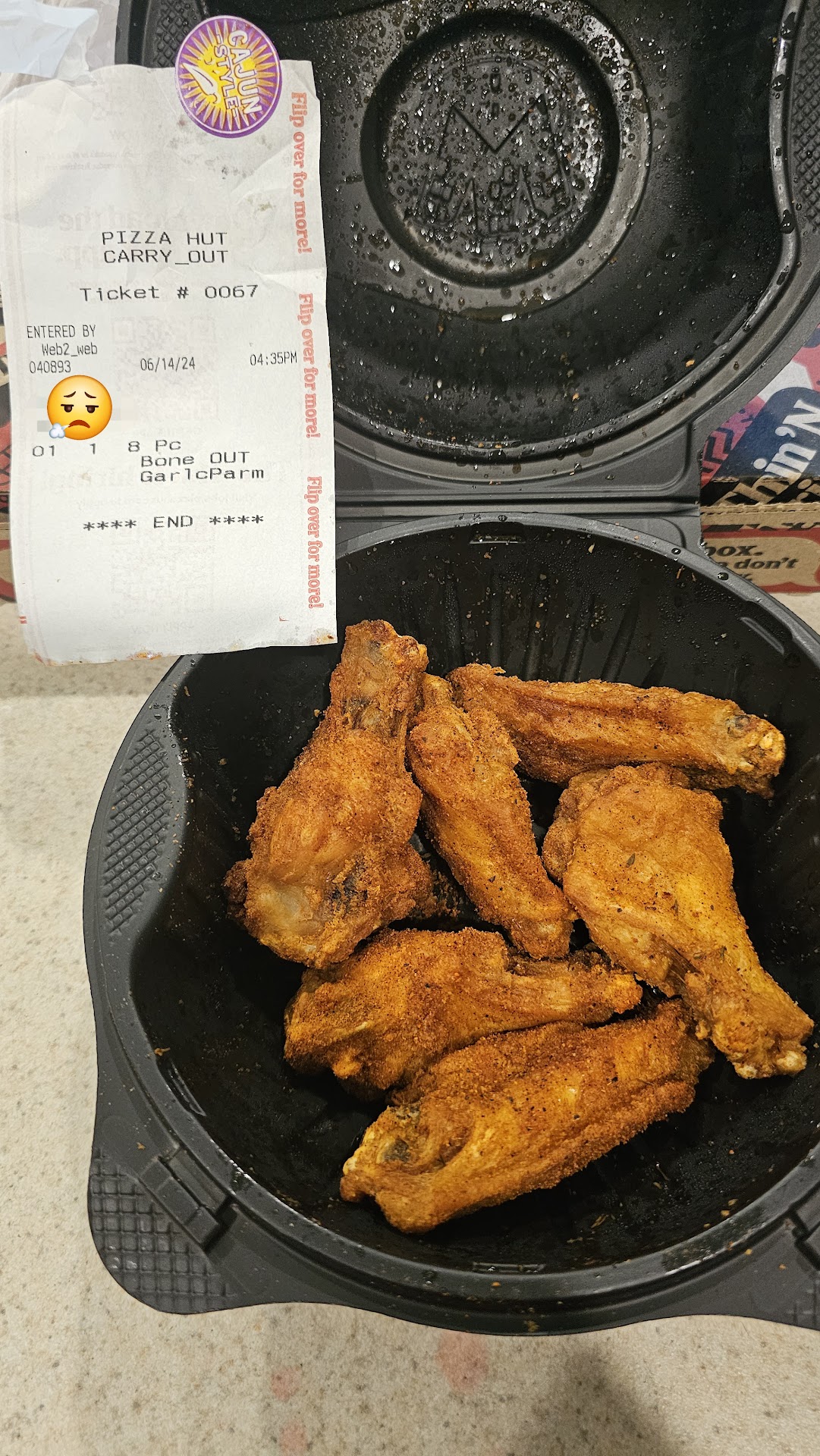 Read moreOrdered a large pizza, with bread sticks and 8 boneless garlic Parmesan wings. Got home, and pizza is fine, bread sticks are fine, but apparently whoever did the wings can't read. They are neither boneless, nor are they garlic Parmesan, not to mention there's only 6 of them, so I guess they can't count either?? 🤦🏻♀️ I live 20 or so mins away, and picked up the order right after I got off work, and so reeeeeeally don't feel like driving all the way back, so this is pretty aggravating. Guess that'll teach me to drive away from the window without checking my...