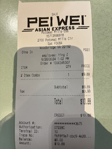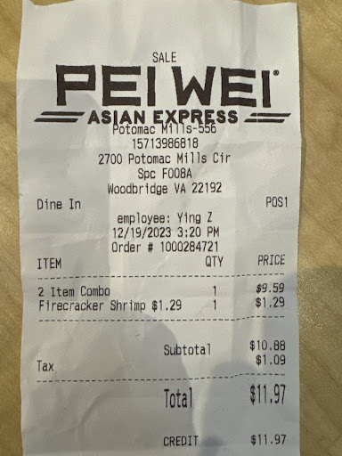 I recently visited Pei Wei Asian Kitchen food stand at Potomac Mall in Woodbridge and unfortunately, it was a very disappointing experience. Firstly, the lady at the counter was very pushy and insisted that I get noodles or rice even though I specifically asked for just chicken and vegetables due to my dietary restrictions. I gave in and ordered noodles with the chicken and vegetables, thinking I could bring it home for my husband. However, when I received my order, I was extremely disappointed with the small amount of chicken and vegetables that were drowned out by an overwhelming amount of noodles. The vegetables were white and showed signs of being frozen and not even steamed properly. This was not what was advertised on the picture above the counter.