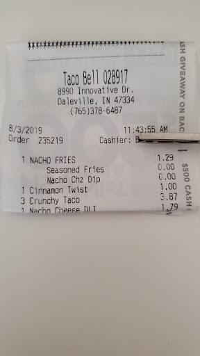 **Update after comment from T.B. I forgot to upload the pics I took that night of the trash & my hollow taco. Considering I'M A DELIVERY DRIVER for a pharmacy!! I am constantly in the weather elements (rain, wind, sunshine). I agree, it was a couple bags but it would've only took all of 3mins to run out and pick up. The parking lot, trash, etc speaks volumes to customers. They will choose another restaurant instead of maybe coming to YOUR TACO BELL, which does have an impact on the community of Daleville. It's employment opportunities, convenient, revenue and the people traveling through who need REFUELING to continue safely while traveling. I live in a community where a White Castle went out of business, because of their QUALITY. In fact, I did a review on here about that particular White Castle, so seeing them go was not a surprise. Here's a picture of the tacos I received that night. I would've liked to have the QUALITY of food 🌯 that was sent out the drive up window mentioned. However, I get without actually seeing what I received, that could've been difficult. I hope my review along with the updated images are helpful. "Sorry seems to be the hardest word"...