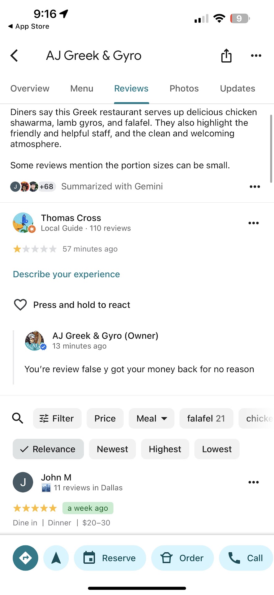 Read more7/30/25 It was suggested by my niece to try this place, she bragged about how good the food was. I explained to the older female taking my order it was my 1st here. I ordered 2 of the Gyro Sandwich Meals and an order of cauliflower. I asked for dipping sauce with cauliflower and she said there was none. I later asked for extra onions, she said sandwich was already rolled, I asked for the extra onion on the side, she hesitates and stares at me and appeared as if my request was impossible. When selecting the drinks with the meal I asked for a Coke and sweet tea, no sweet tea, I asked for the bottled Lipton Tea, she said $1 more. I advised I don’t drink soda and could I get the Snapple juice, again no and $1 more. She offered bottled water, I settled for 2 Cokes. The COLD cokes were placed in the same bag as my hot food. Arrived at my niece house and there were no extra onions as I had asked. The food was good, but the several NOs, up charges for drinks, because of no sweet tea, no dipping sauce for fried Cauliflower, cold beverages in same bag with hot food, no extra onion on the side and just the unacceptable experience as a 1st time customer. I will NOT...