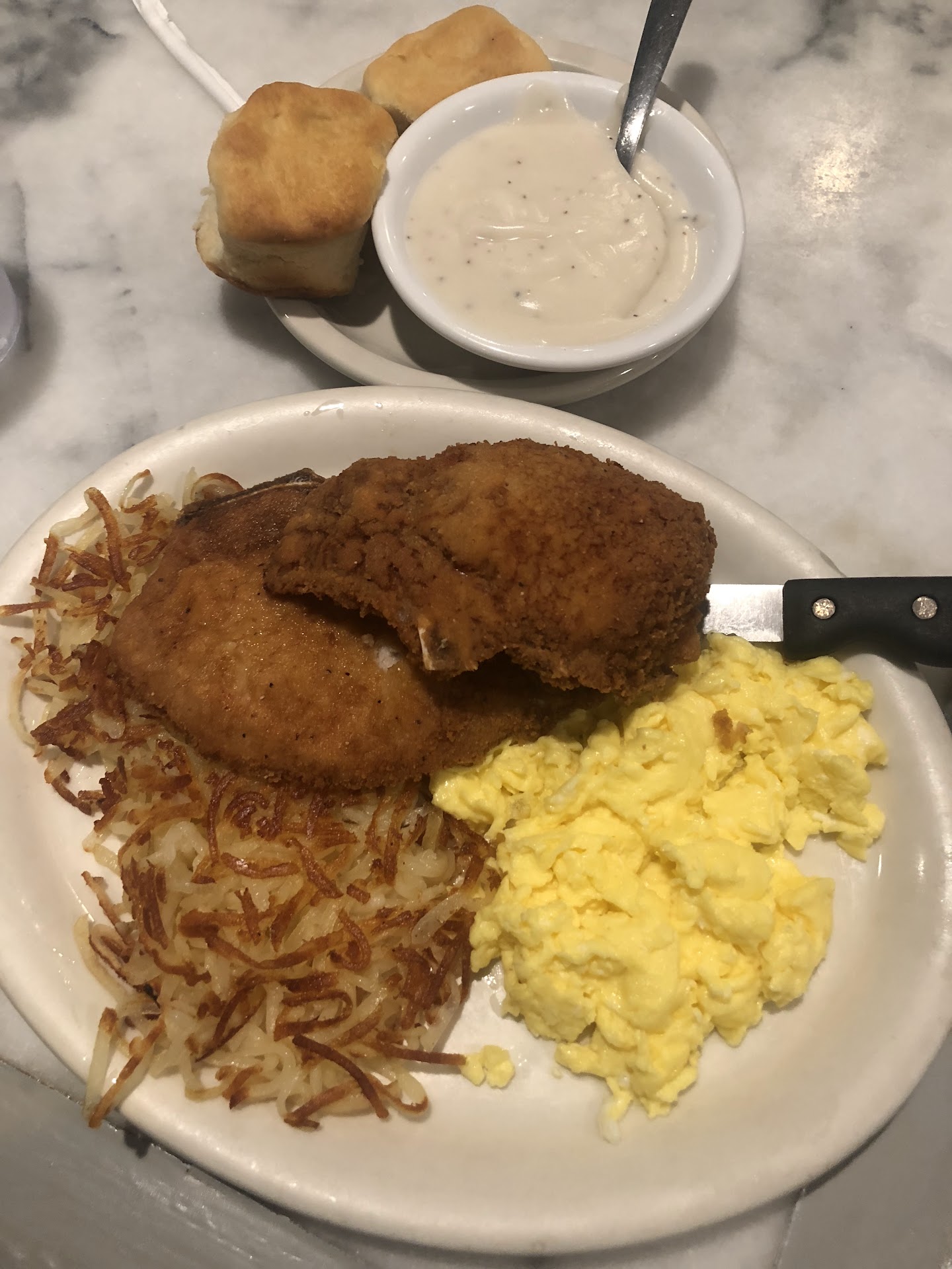 High standards for service and customer satisfaction. I hadn't clarified my dietary restrictions and much to my chagrin discovered that there were ingredients on my plate that I wouldn't knowingly consume. The staff refreshed my plate to my satisfaction without a single murmur. That is the essence of service in a breakfast diner - so what if we are busy, the customer is always número uno. The two types of omelettes were more like folded crepes with fillings and toppings. The side accompaniments were plentiful and generous to be sure. Coffee was replenished with embarrassing regularity. Given the booths and assorted rooms and tables, this place is good for a small group meeting or even dining alone since sound dissipation is inaudible.