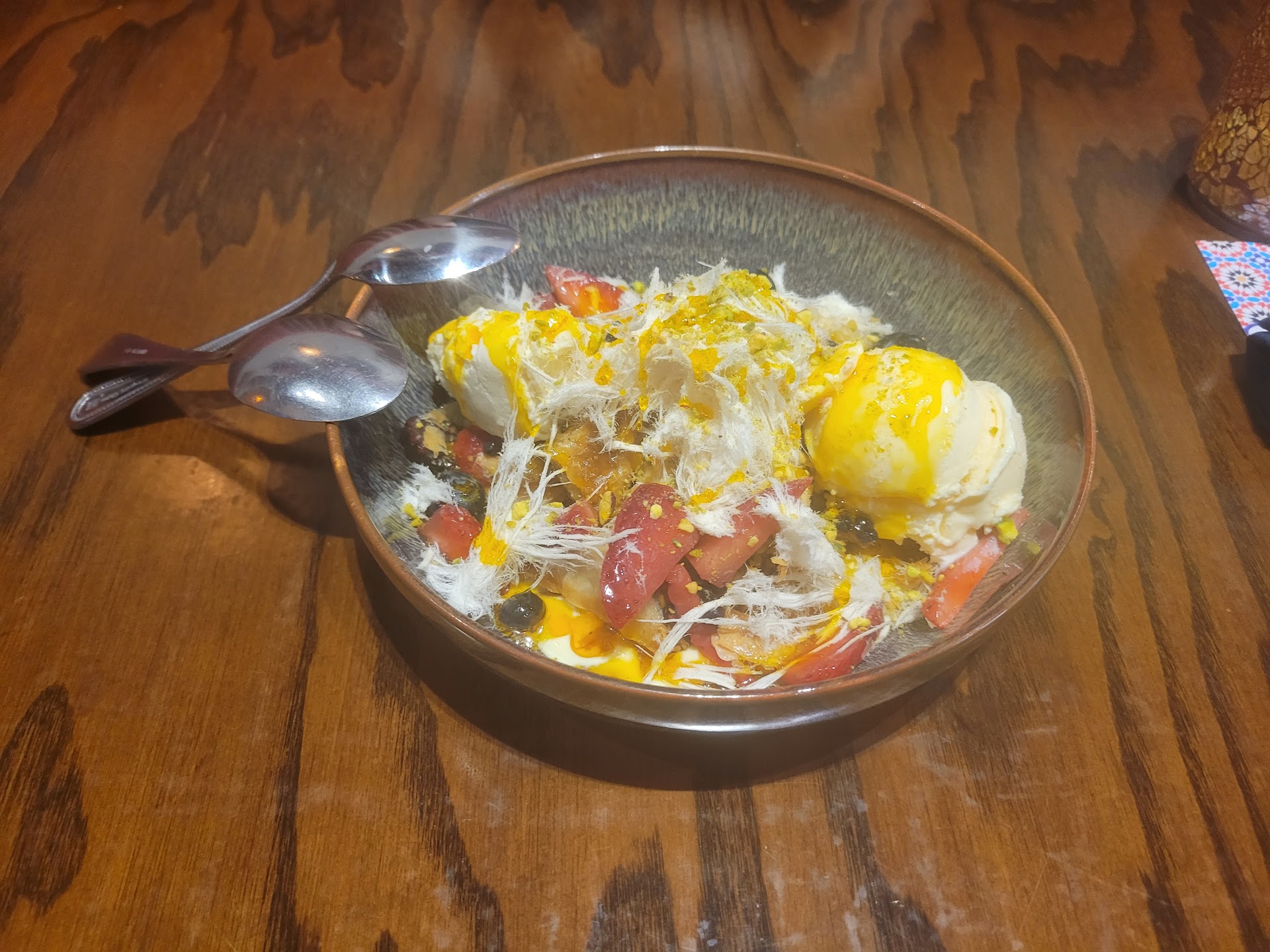 We had the full layout- appetizers, main dishes, drinks, hookah service, and desert. Dropped about $250 in food and drink and we were there maybe an hour and half.