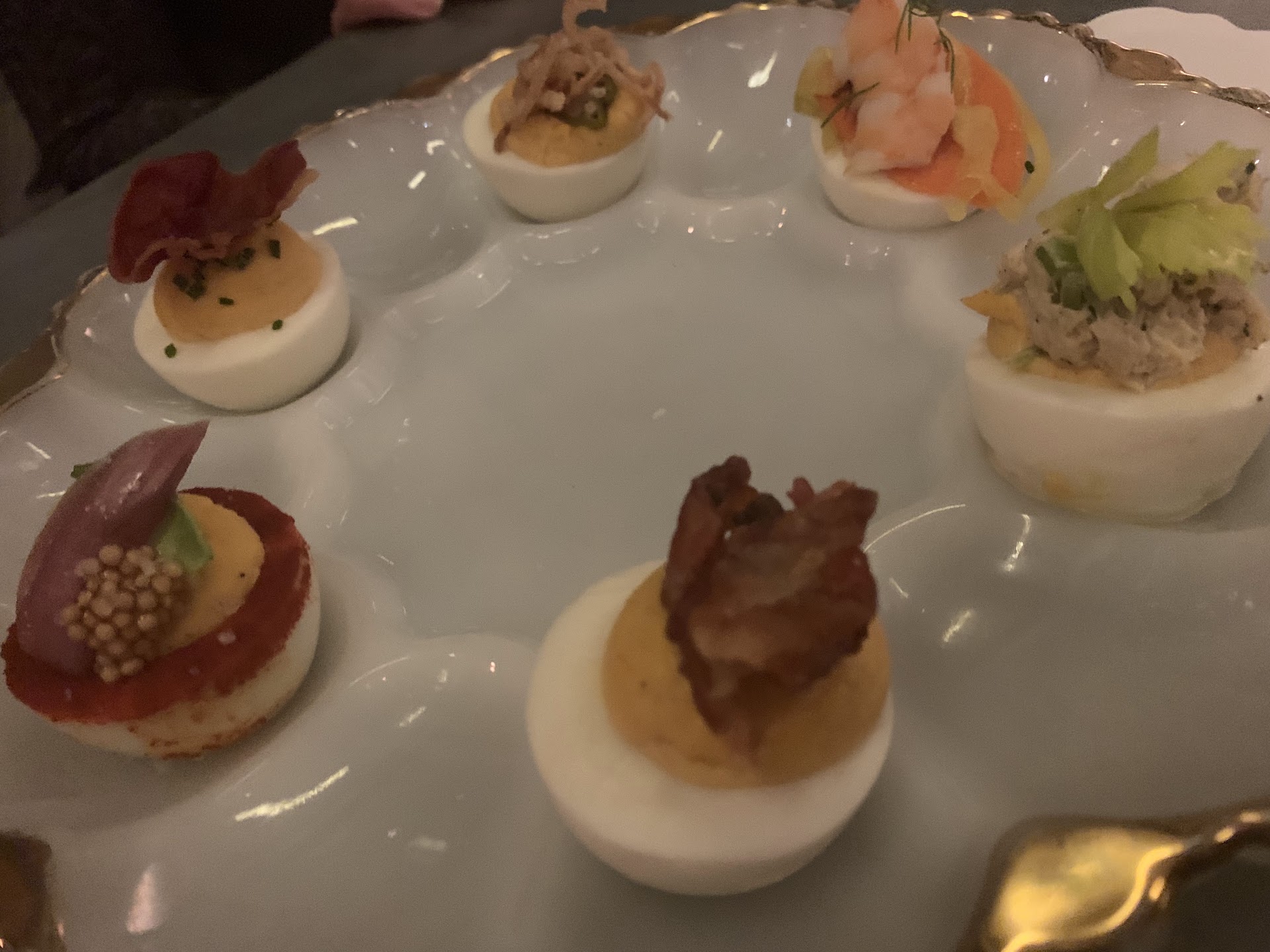 Deviled eggs: very good. I donât mind deviled eggs, but I donât just love them. My companions seemed to really enjoy them though. You got three different kinds. One had blue crab and two had crispy bacon but were different. If you like deviled eggs, definitely give these a try.