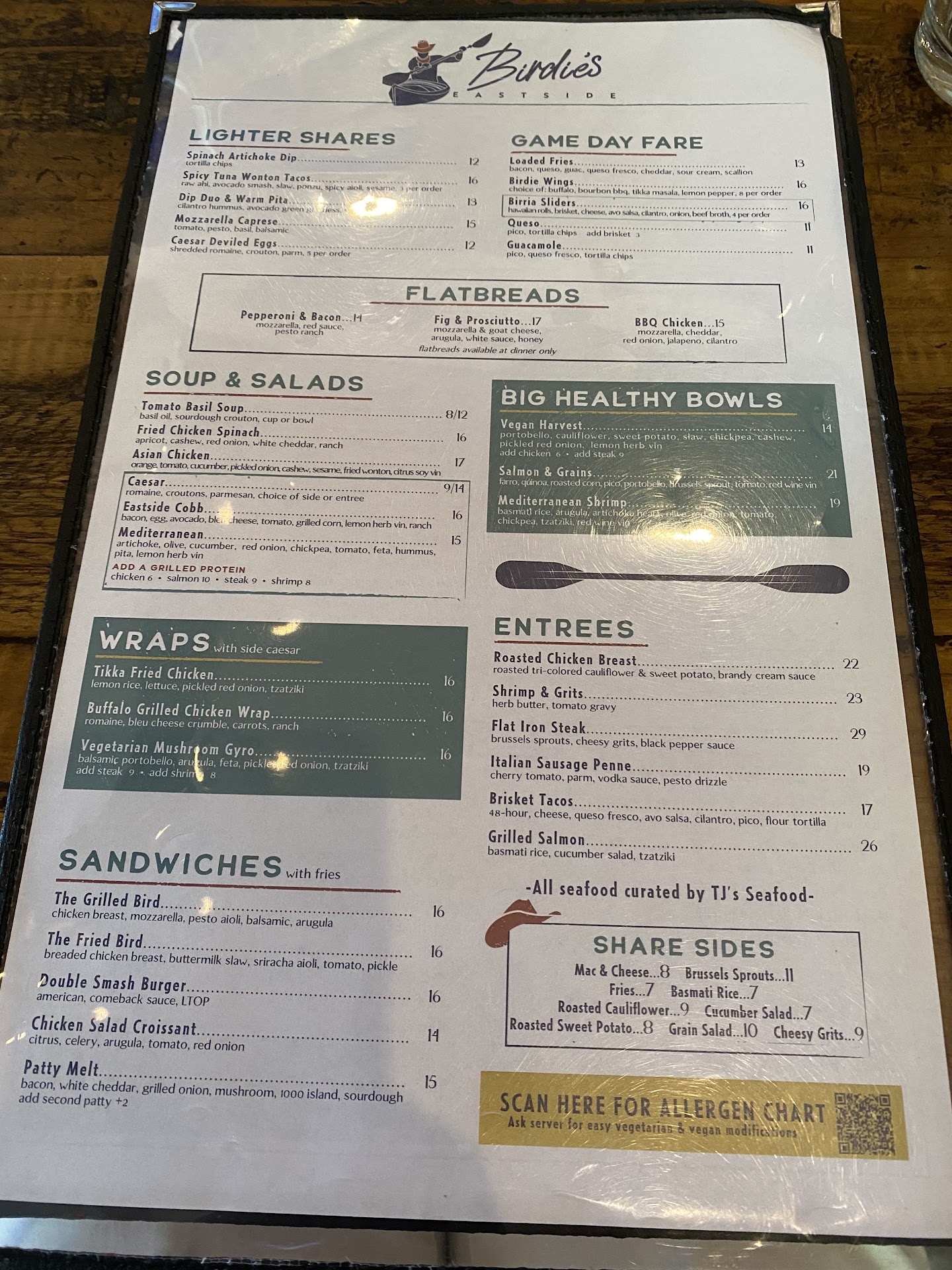 High hopes flew South at Birdie’s Eastside. We’d been eyeing this place in our neighborhood for a while, noting a consistently full parking lot and busy patio, and we finally decided to give it a try. The atmosphere is inviting. Hostesses were friendly and quickly seated us at one of the the coveted outdoor tables on a pleasant evening. It was moderately busy with most tables full outside but only a couple occupied inside. It took a several minutes but a waiter did arrive with waters, and we decided to place food and drink orders at once since we didn’t know how long the wait on food might be. Kitchen runners delivered order fairly quickly. All items correct. Unfortunately, that’s where the good ended. Our child got a pasta dish which he mostly enjoyed but we all noted it was absolutely swimming in sauce. The salmon grains bowl was probably the worst item we tried. While the base of farro, quinoa, and Brussels sprouts and corn was fine, the star of the show, the salmon had no seasoning…as in zero. It was dry and overcooked to the point of albumin seeping out. Tragic fish. My husband had the grilled chicken sandwich, and again they protein was woefully overcooked to the point of needing more condiment, any condiment, just to choke it down. Accompanying fries were tasty. About 75% of the way through our food, the waiter comes by for that first bite check. At that point we ask for the check knowing we won’t see him soon if we don’t. When it arrives, it has the two iced teas that we ordered but never received and gave up on. When we pointed it out, he mumbles an oh sorry. And presents the adjusted bill minus the tea. No offer to get us tea. No offer of a to go tea. No offer to fill our now bone dry water glasses. Suffice it to say, he laid an egg. It’s a nice atmosphere, and we’d hoped for better, but if this is the standard for food and service, it may as well have just stayed Luby’s. In fact, it’s not a stretch to say we have eaten better food at a Luby’s than what we had tonight. Squawk! Sorry, Birdie’s. Love my neighborhood and love the concept, but we’ll fly on by next time we find ourselves hungry on...
