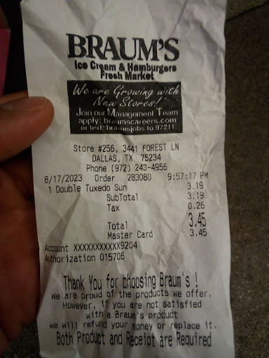 Well I have to go all the way back a year what I remember I have been to this Braum's Ice Cream and burger fast food this is the one on Forest Lane I was in the area three times at least going to get ice I love that crush ice also I got some french fries I asked them to cook it fresh y'all know how it is. French fries is better when they cook fresh I'm not too fond of food when sitting up I'm not saying they serve food been sitting up I'm just saying I want my French fries freshly cooked. I know somebody on here feel the way I feel if I can say. While I wait patiently learning how to have more patient as I do I kind of feel like I'm getting better at it especially when I'm changing my life to be a better person each and every day that God blessed me on this Earth. So my fries is hot and the way I like it just a little bit of salt not too much is not good for you and it don't taste good when you put too much on it salty as I say. Also I got a burger another time and I wanted it freshly cooked and I watch them cook it I like little extra pickles and onion heavy toasted I am trying to tell you when you are ordering your food and you like it to be right and it is that make your shopping experience very good I think. I think it's very important to each other on here to tell our experiences. Have you tried the banana splits if you haven't and you like banana splits give them a try if you like nuts ask him to put a little nuts on your banana split and tell me about it do that for me. I'm so happy that I am blessed to be here on this Earth One More Day and I will fall in heaven bless me to be here to be able to tell you my stories. Also I like to share some of the co-workers that work for Braum's company if I can say the store did I visit more I just want to tell you how satisfied that I am of the Irving store I'm thinking the corner of Shady Grove in Irving some like that anyway it wasn't a problem it was just at that time it was a mixed up in my order one time but the manager came to my rescue me just want to say that she came and took her they little mix up and made it all better I say. When she came to correct the situation she did not have a frown on her face and also she did not act like she was upset sometime I can tell when someone upset about something or they don't want to correct it they have a bad attitude and I also a frown on their faces that's pretty much when a person don't want to do what's fair to you. But the management save the date that's why I can tell you my story. Their customer service is 100% on point so I am a satisfied customer and mine experiences has been so great and pleasing to us. Forest Lane, Shady Grove Braum's when I say this I am truly speaking from our experiences to all of the hard workers at Braum's thank you so much for all that you do for us when you go out your way sometimes just to please customers like you do. And I also thank you for the care that you showed customer like myself it would be very nice if someone else could show some appreciation to these hard-working people of Braum's because I'm not the only one that has visit these stores. Thank you for the opportunity to voice out our...
