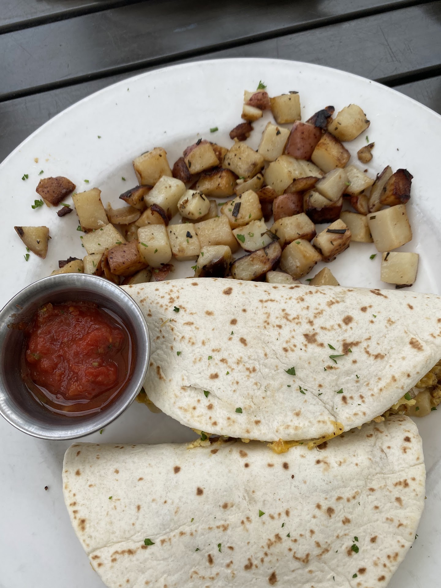 Despite this being in Dallas and having a nice atmosphere, the food is actually good. I didn't expect my salmon bagel to fill me up but it did. Very meaty, they packed the salmon on it. It was also topped with red onion and what looks like mini olive seeds, comes with cream cheese. The bagel was a nice crispy exterior. The salmon does get a little salty after awhile. The fruit was sweet and refreshing, very complimentary to the bagel and acted like a palate cleanser after the salty salmon.