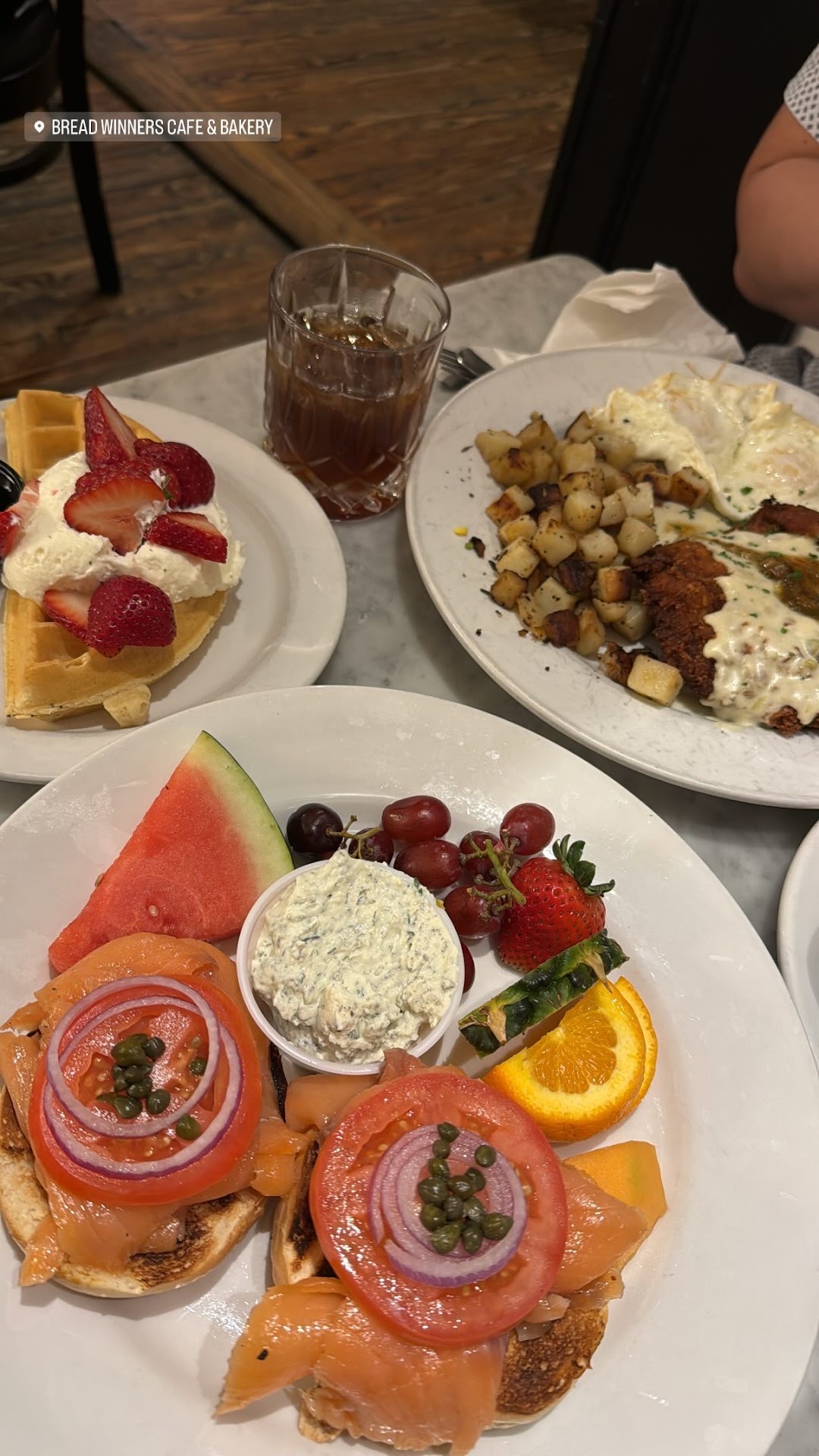 Prices are a little higher ($19 for a big plate of salmon bagel with fruit, $13 for a whole waffle topped with whipped cream and fresh cut strawberries, and $15 cold brew old fashioned) but you're paying for the atmosphere and the quality of the food.