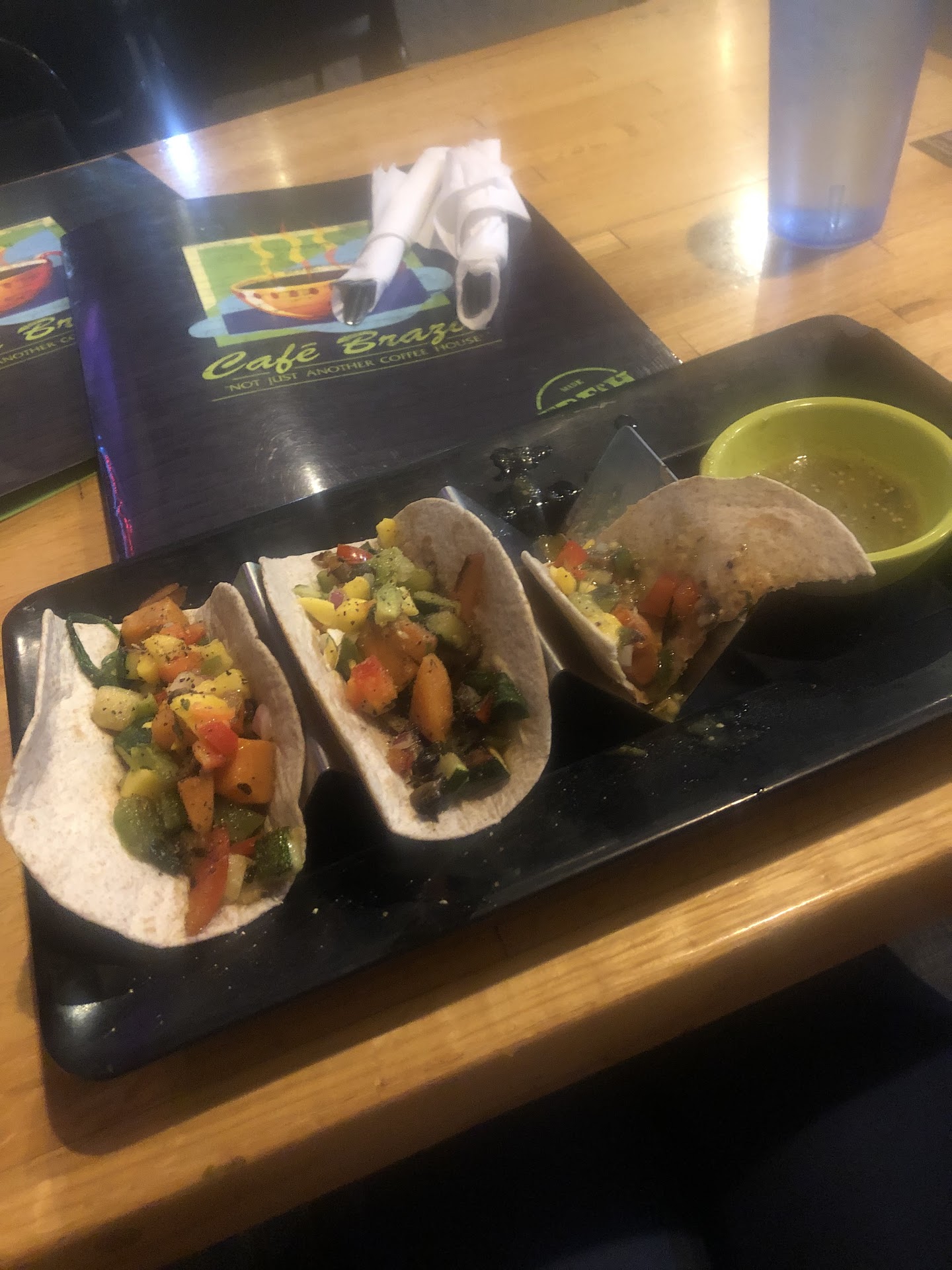 I’m not excited to admit that I’ve been down in spirits and luck enough lately that many of my bills have been too much to handle, my electricity bill being one of them. Realizing one night that my power was cut, I also realized that I needed to find a place to charge my almost-dead phone so I could have an alarm to get me to work on time the next day. So I went to the first place I thought of that I could walk to and that would be open late - Cafe Brazil. I’ve enjoyed it a number of times before, and I appreciate their variety of vegan options to accommodate my lifestyle and the chill environment. Going in there to just use a power outlet and being too broke to buy anything, I was nervous about requesting a chair - but the guy I ran into first, Tracy, was quick to say no worries and let me grab a spot. I’ve been coming here every night for about a week after that now and no one’s ever been unkind, and they’ve always grabbed me some much-needed water to keep me hydrated in this July heat in Texas. This particular night, and the reason I wanted to write this review, Tracy brought me out a pancake! I was thrilled, as I was just lamenting to myself earlier that I had only eaten a couple slices of watermelon today. I hadn’t been able to sleep last night and I was afraid that today’s hunger was going to make it hard to sleep tonight as well. But Tracy took that problem away. I had to let him know, however, that I couldn’t eat it, as it wasn’t vegan. He kindly took the pancake back and cooked up some tacos which he just made the recipe up for off the cuff. He asked me to let him know how they were and they were excellent!! I took a picture of two-and-a-half out of the three because I was so eager to chow down that I forgot to get the pic before I started enjoying the first one. But it was super tasty, filling and an absolute blessing! I used to be an atheist but nowadays I tend to think there is a God out there who cares about us and works through us sometimes to take care of us when we need it most. Tracy must be a hard worker because I’ve seen him up here every day for about a week straight, and obviously he has a heart of gold. I will be sure and bring some money up here for him to be paid for it once I’ve got my bank account back up. Having such good work ethic and such a caring spirit, I hope he has a pay raise or promotion soon, and I hope he is fortunate in all he does going forward - I really believe he deserves it!...