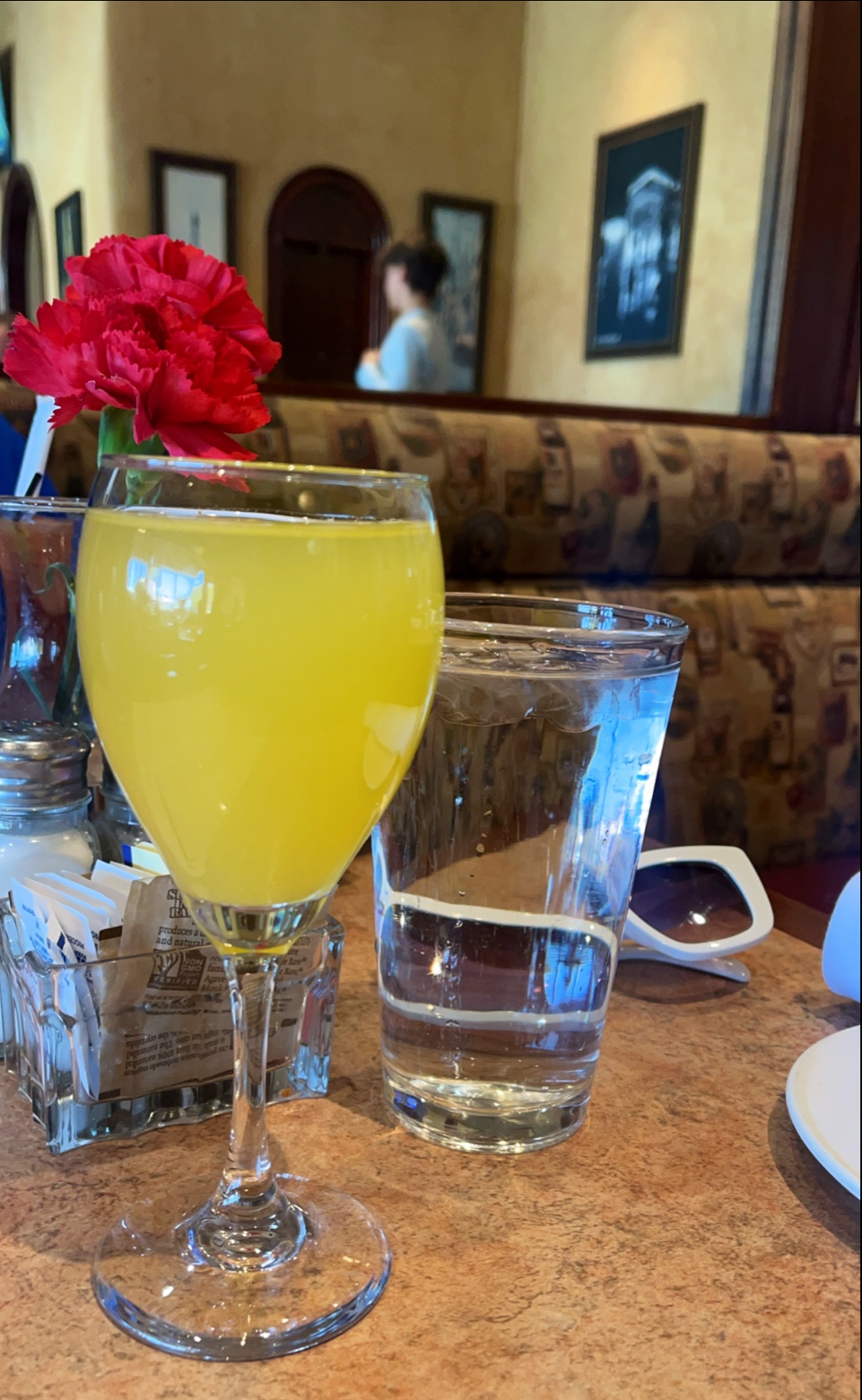 Additionally, I ordered Buttermilk Pancake Combo, but the food I received was subpar. The eggs were alright but in all honesty making eggs at home would be better. The sausage was the best part. I’m not saying it was the best i ever had, but in comparison to the rest of the food, it was good. The pancakes were not what I expected though. I don’t know who this was meant to fool, but it was very clear that the pancakes were made using old flour, as was indicated by the taste. They were also presented as if they were over cooked, having the better looking side on the bottom. What I ordered to drink was Freshly Squeezed OJ, yet what I received was Tropicana OJ with pulp. I can’t necessarily prove that it was Tropicana OJ with pulp aside from saying that I saw the waiter pour it into the glass he gave me. Yet I can mention that the taste was the same as it, with the color being the same and as those who have made fresh OJ you’ll know that the color is different that that in a bottle but in this case it wasn’t.