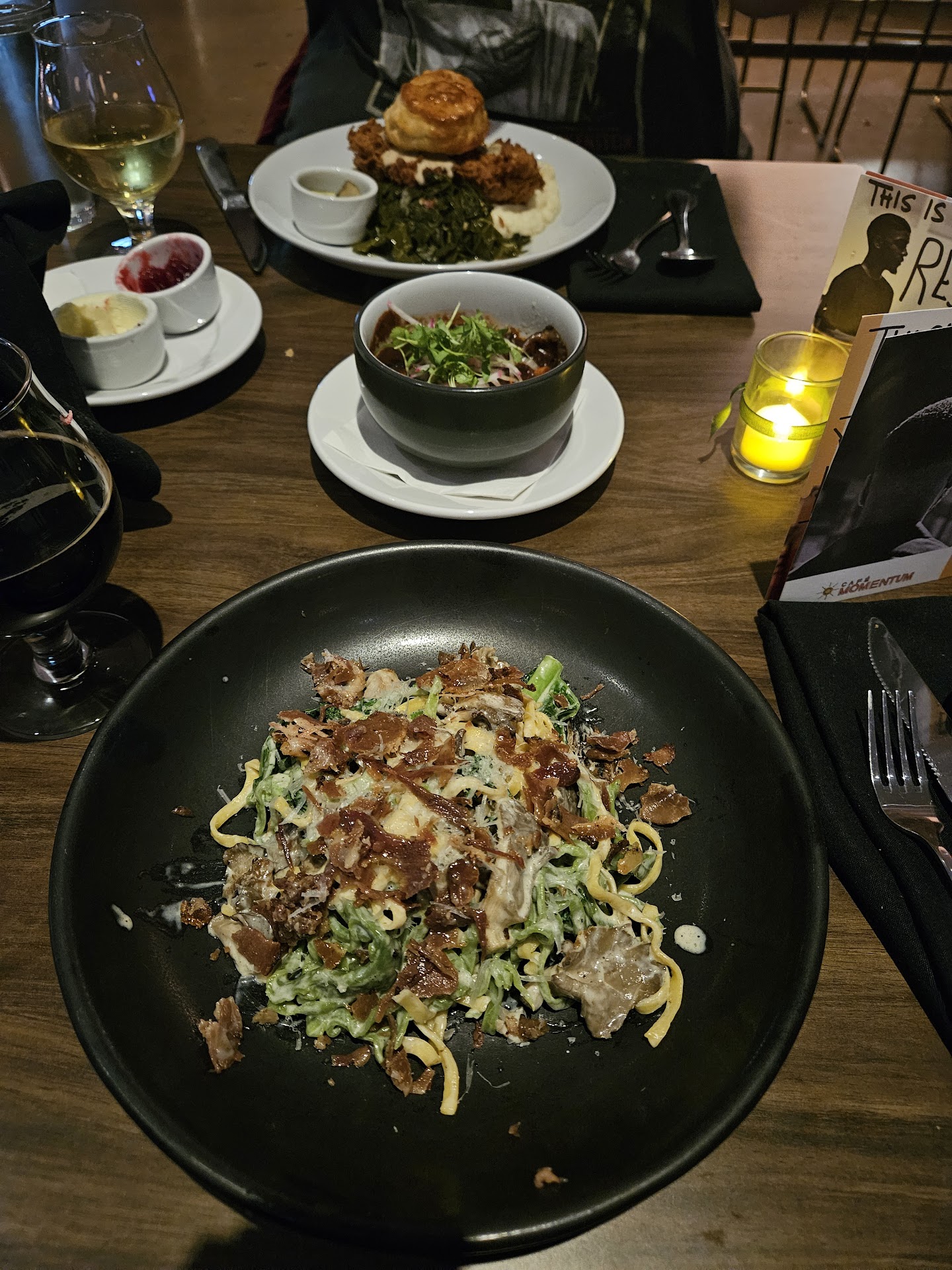 In general the main courses were okay. I personally had the fried chicken with honey biscuit, greens and mashed potato. My greens were TERRIBLE I could not eat them and my biscuit was doughy and under cooked. The chicken and mashed were very good (those two things are what helped this rating get 3 stars.)