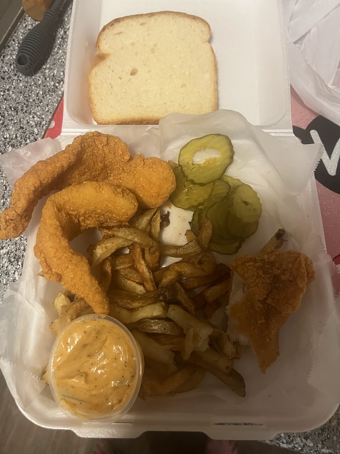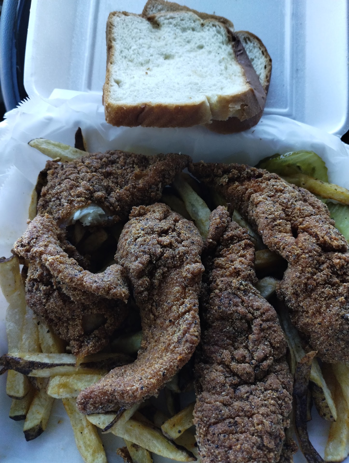 Ā Ā Ā Read moreOut of my (insert age here) years I've always passed this place up. Now I'm highly disappointed that i have all these years! The first "taste test" bite was so good I said screw a pic lol. I called in a 4pc spicy fillet order, took them no time to make it. The customer service was wonderful from over the phone and face to face. Ok to the food lol. First of all, I opened my box to see I not only had 4pcs of fish but they even gave me 2 more pcs! I think this place is one of the few that actually still give you bread like whats fish without bread! I wrapped a pc of bread around my fish and dipped it in their tartar sauce (just looking at the sauce it looks AMAZING) Y'all I almost went back to the place to slap WHOMEVER made that tartar! On Jesus and everybody else it was GOODT! Not your normal tartar, this one I taste a hint of sweet smokey flavor and it sets it OFF! All that with the pickles and pepper! Yes LAWD! Not a big fan of the fries though but I WILL...