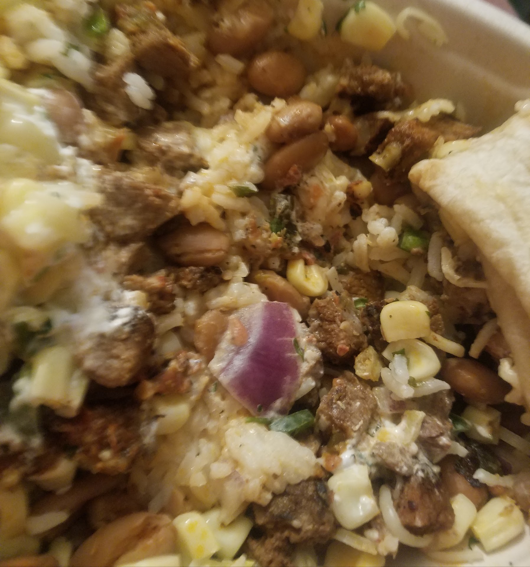My burrito became slowly caked in food that was spilled down the entire prep line. The outside foil was covered in previously spilled food/sauce and they didn’t even bother to cover half of it. I threw out my uneaten burrito on the way out the door because I could not bring myself to eat it.