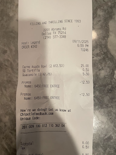 I used to go once or twice a week and never had problems, as a matter of fact, the food was way better than when I used to go when I lived in a different part of town. The kitchen k used to go to in Richardson was slow, the food was never really anything to brag about so I just quit going. When I moved into Lakewood, I tried the Chipotle on Abrams and Richmond once hoping it would be better than the other location and I was happy it was way better. The food was consistently better, hot, and I usually get a bowl with chicken and it wasn't dried out and had more chunks of actual good meat, not pieces of burnt crunchy whatever it was... anyways I've been going there once or twice a week for the past 2 months, up until last week. I got one of my usuals, got home and it was almost cold. Keep in mind from the time they put the foil lid on my food, to when I get home and eat it is maybe on my ten minutes, like I said I live right around the corner so i get my food to go. It wasn't a big deal the first time, I just nuked it in the microwave and ate it. I went back on the same Friday, same thing. Got home, food was almost cold and this time the chicken in my bowl was bad quality. I've been working in a kitchen for 16 years, most of that at pappasitos, but that's besides the point, I have an eye and mouth for chopped chicken, it's kind of hard to mess up. I feel like it was the bottom of the pan and instead of just throwing away the burnt, dried scrap pieces at the end of the pan it was put on top and mixed into the new pan of chicken brought to the expo line when they ran out. I reached out to the contact number on the receipt, just to let them know because if there is a problem effecting consistency, it should be brought to their attention right? Well no one has contacted me back to let me know they got the message. I'm not out to score free meals or get gift cards.... I work in a kitchen at a country club, I eat good every day. Sometimes I like to stop in to Chipotle on my way home if I don't feel like making anything at home or I might meet friends or family there because it's one of the more affordable places to eat in Lakewood that's easy to get in and out of if I dont feel like spending an arm and a leg getting lunch... I hope maybe a manager or corporate member will read this and bring it to the store owners attention, and that they return to that good consistent food they are used to serving. I might go back in sometime soon and asking got a manager to being it to their attention, I would usually go in about an hour to an hour and a half before they closed. I know it's toward the end of the night, employees are trying to leave, so corners get cut and kitchens usually try not to keep alot of food in expo at the end of the shift, but fact is, you still are open and serving food, and that doesn't mean quality has to go down the last hour or so. That being said, sorry for the long story, all the employees are very friendly, I'm always in and out very quickly, kitchen, (mens)bathroom, and dining room are kept pretty clean, food is priced fair, I just had to give it 3 stars because of my 2 recent visits, and 5 stars would be if this chipotle and all other locations just blew me away judging all aspects of a nicer fast-food joint. I don't even like to call it fast food, because we usually associate fast food with having a drive thru, and there might be some with drive thru's who knows. Anyways....hope my short story is useful to...