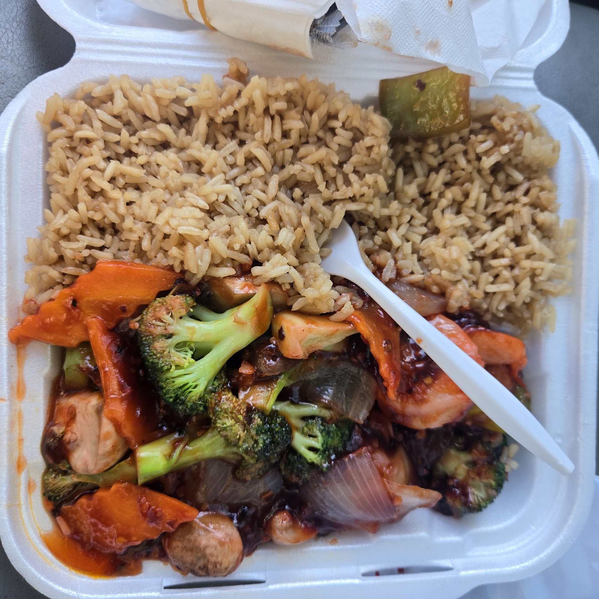 The dining room is spacious and nice but they bring your meal out in take out containers. They also give you plastic utensils. I wouldn’t mind this so much if the broccoli/veggies were cooked longer. The broccoli was so hard my mom couldn’t pick up the broccoli with the spork provided. Not only were they hard but they weren’t cut so we couldn’t scoop them up either because they were so big. You’re better off getting your food to go and eating at home with your own utensils.