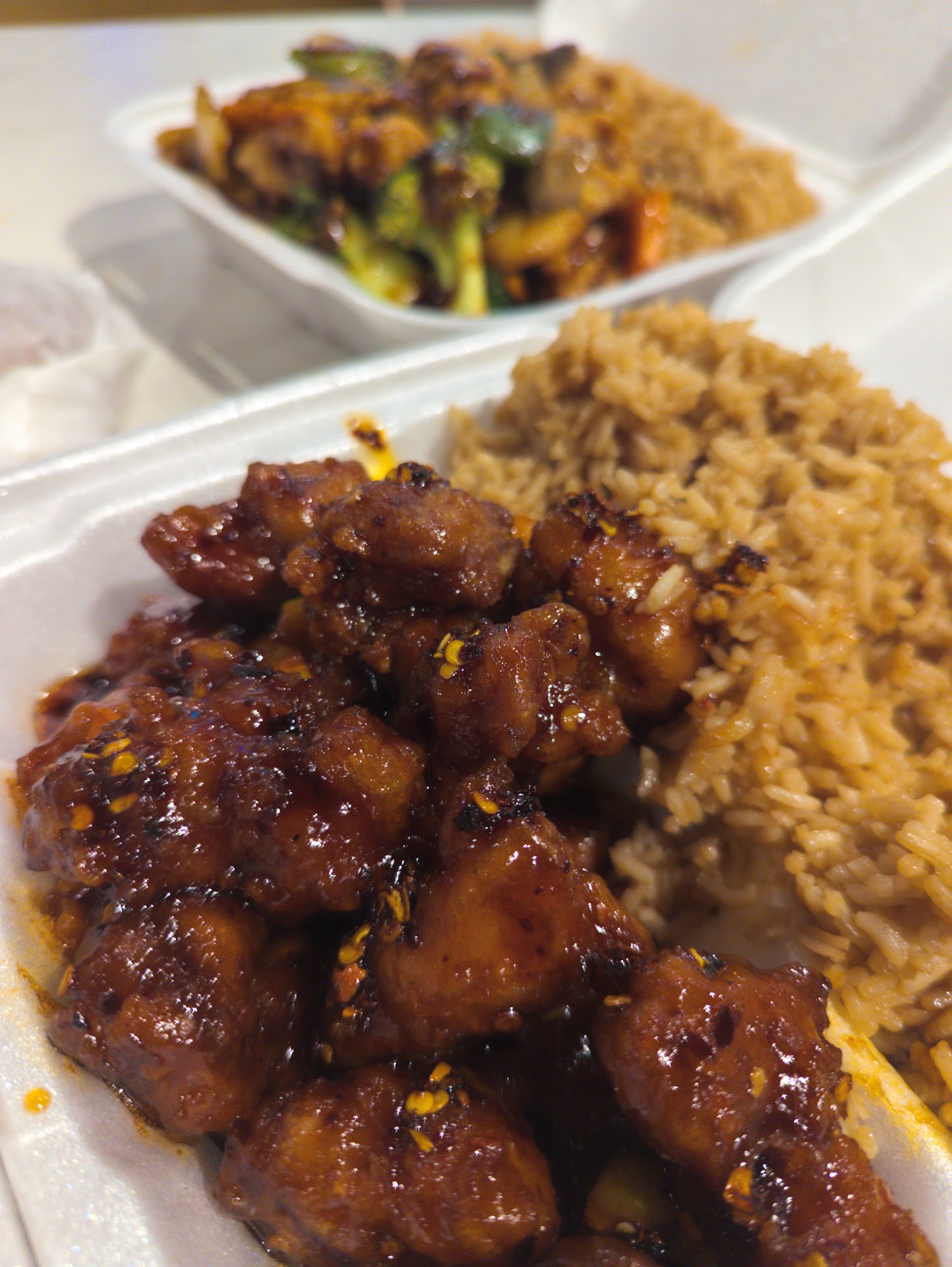 Read moreI'm deducting a star for lack of spice level of my General Taos Chicken which usually packs a punch but not theirs. We went for lunch today. It was our first visit. We ordered "large" sizes of the Sesame Chicken and General Taos Chicken both with fried rice. The portions in a large are plenty for two people to share. The star of our meal was the Combination Egg Foo Young which came with the brown gravy and Lo Mein. Both were simply outstanding. I honestly think it was the best Egg Foo Young I've ever had in my entire life and I'm 63 so I have had ALOT. To be honest we did not eat the brown gravy with it as it was so perfect on it's own with plenty of meat and veggies. It was cooked perfectly. They offer hot chili oil and a container of soy, duck and hot mustard packets with Siracha upon request. The food is served piping hot in styrofoam to go containers but they did have paper plates so we could share our dishes family style. They only have plastic utensils and need to upgrade their dining in version of those and also include spoons. The plastic knives were of better quality but the forks barely allowed eating. The napkins provided were of good quality. Those things matter. The restaurant was spotless and bright and the girl taking orders was sweet and spoke English and Spanish. I hope they make a few changes and succeed in that location as it's close to Irving too...