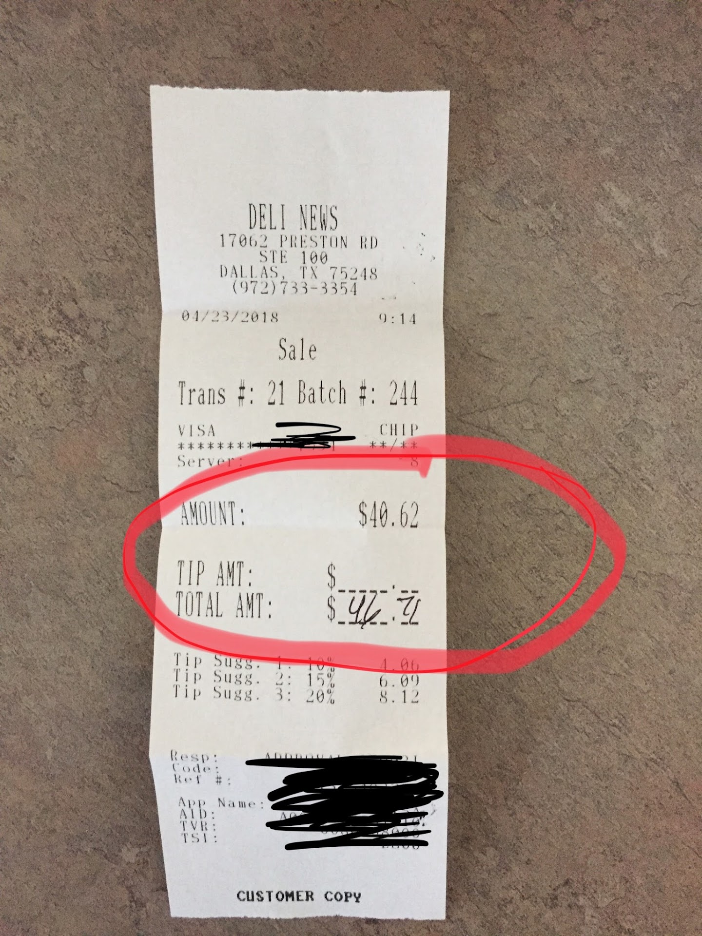 I paid for my bill ($40.62) with a credit card and left a suggested 15% tip. The total was $46.71. Few days later, I see that my credit card was charged $72.38.