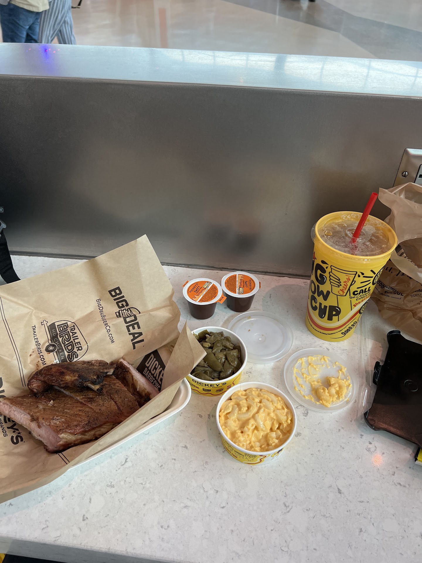 When is something that is defined as "homemade" not homemade? When in comes in a package that says Monarch Ranch and is obviously something that was made far away in a factory - no home involved. I hate that Dickey's has fallen so far - I have been eating their brisket since they were family owned and the family was behind the counter. Now I paid almost $20 for a sandwich combo that should have been called a slider. Two small pieces of meat that even though I asked for sliced thin and lean, was mostly fat. I guess you could say they did slice it think though -there wasn't much to those two meager slices on my sandwich. I asked for sauce on the side which seemed to really annoy them. Since I was getting ready to get on a plane, that seemed like a better option. After he poured out a thimble's worth of sauce, and I asked for more he seemed really annoyed, and after they bagged my order they didn't put any sauce in the bag. I guess they showed me! I know the Dickey's yellow cup is a branding item, but what a landfill filler! So much waste for no reason.