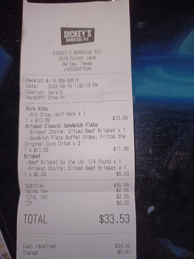Read moreMy normal Dickey's was completely out of brisket yesterday so I went to this location. The brisket can only be described as terrible. It was boiled meat. It was gray, had no bark, and a lot of fat. There was absolutely no flavor: no salt, no pepper, no garlic, nothing. Nothing could salvage this bland meat including a large amount of barbecue sauce. I drowned this meat in sauce and it still tasted like nothing. I threw it away and will never be back to this location. The only saving grace was that it was cheaper than my normal location. However, I'll gladly pay the extra $5 for brisket that's...
