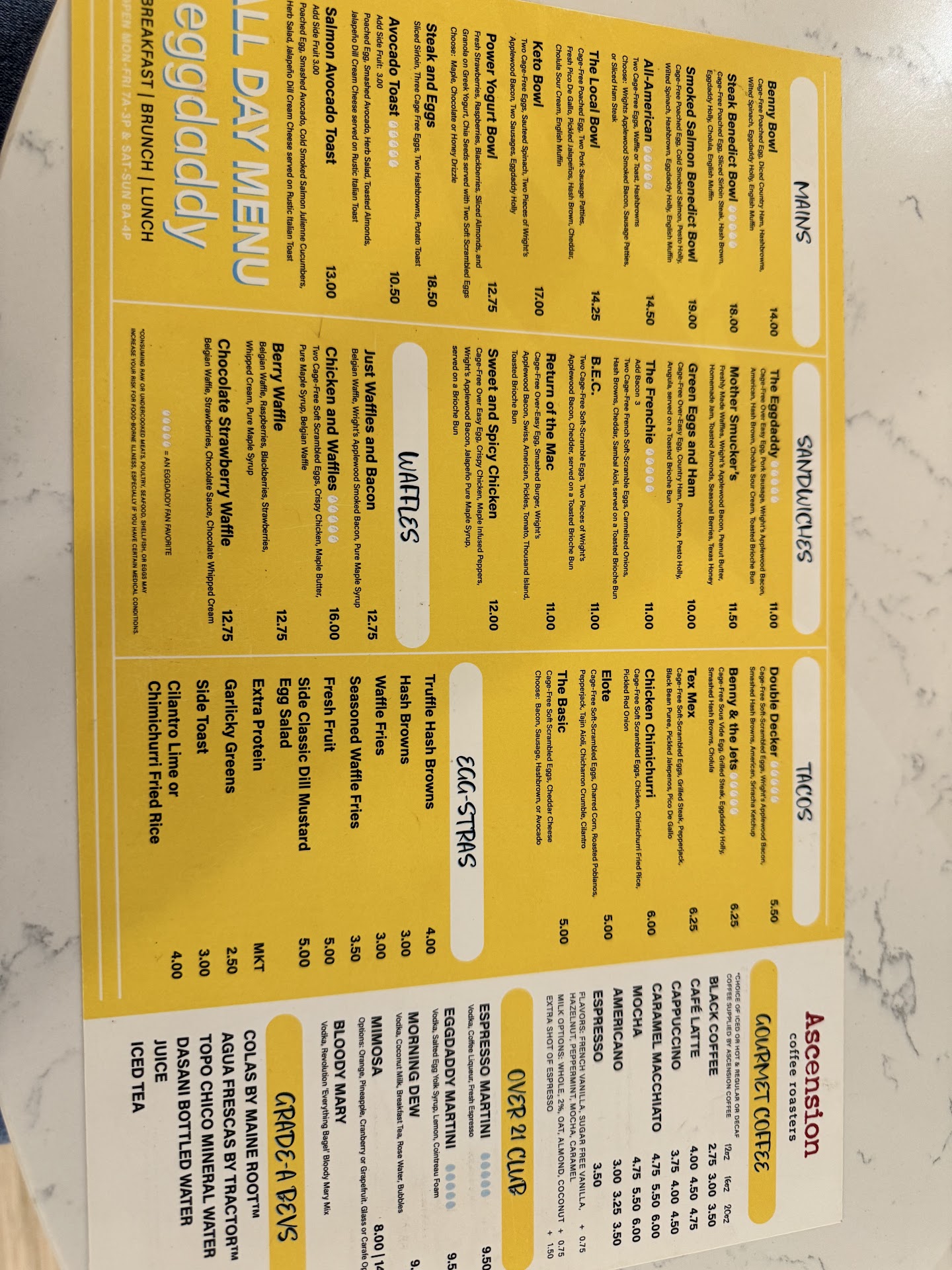 Fun, flavorful menu choices at this establishment!!!! I was looking for something new and different. Boy did I find it. Located off of Dallas Parkway in Addison Texas, this restaurant screams fun and tasty. The decor is all egg themed and for those of you old enough to know, the booths resemble Mork from Ork’s egg pod spaceship. There were just too many menu choices to choose from, so I decided to play it safe and ask my waitress for her recommendations. She explained that the egg daddy sandwich is the best seller amongst their sandwiches. She also suggested I pair it with the Truffle Hash Browns. The sandwich itself is a sausage patty, applewood smoked bacon, a hash brown patty, american cheese, a chalula chipotle sauce topped with an egg cooked over easy and served on a brioche bun. The truffle hash browns are shredded hash browns formed into patties and served with a garlic flavored oil and truffle cream sauce. The first bite of the sandwich stirred up a couple different thoughts in my head, the first being uh oh, I didn’t ask for extra napkins. The second thought being damn, this sandwich is really tasty. So I put any thoughts about the napkins to the back of my head and just decided to roll with it. This kind of made my experience a little more enjoyable. The truffle hash browns definitely complimented the sandwich well. The combination of the garlic oil and truffle sauce really brought these hash browns up to next level. Once I finished the meal, the waitress brought me my check. As an added bonus she thru in a couple of wet naps. They really thought of everything here. I was impressed. The food was not that expensive either. All in with 20% gratuity, my meal was $23 and some change. Would I recommend this place? Absolutely! It’s fun, it’s fresh and it’s definitely a must try! I will be coming back!!! My score, I give egg daddy a 4.36...