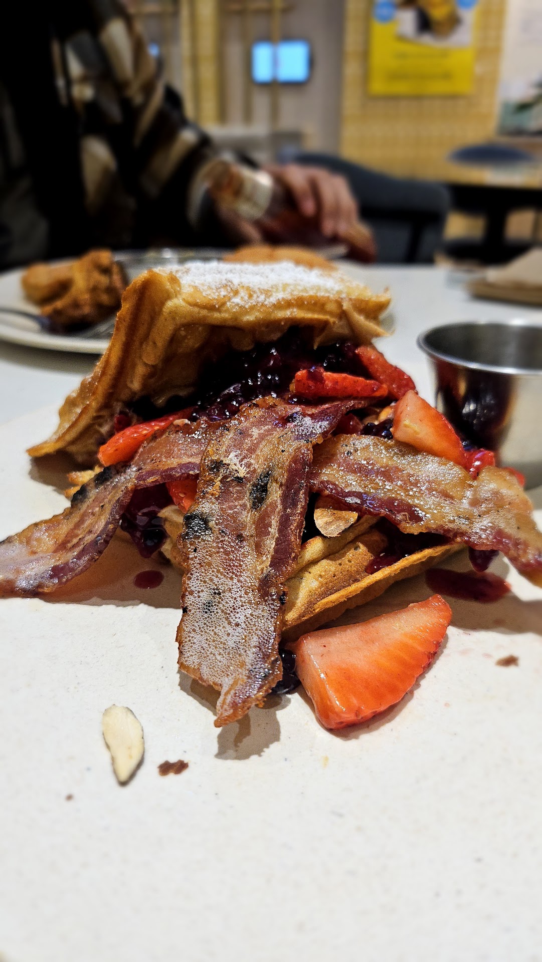 The FOOD was incredible. The pictures below show their Keto bowl, which includes egg, bacon, sausage, spinach, and cheese. This was very flavorful, satiating, and definitely a great carb free option. Another item was the avocado toast. The toast had avocado spread, sour cream, an egg cooked to your liking, some herbs to flavor, and what seemed to tasted like a hint of lime. This was delicious, BUT for someone of my size, it was a small portion. The third item is the motherschmucker, and yes, as you can imagine, it is basically a dessert sandwich. No complaints though! You have bacon, strawberries, berries, almonds, honey, peanut butter, and jelly, all sitting nice and comfortably between two waffles. I don't think I have to tell you how good this was.