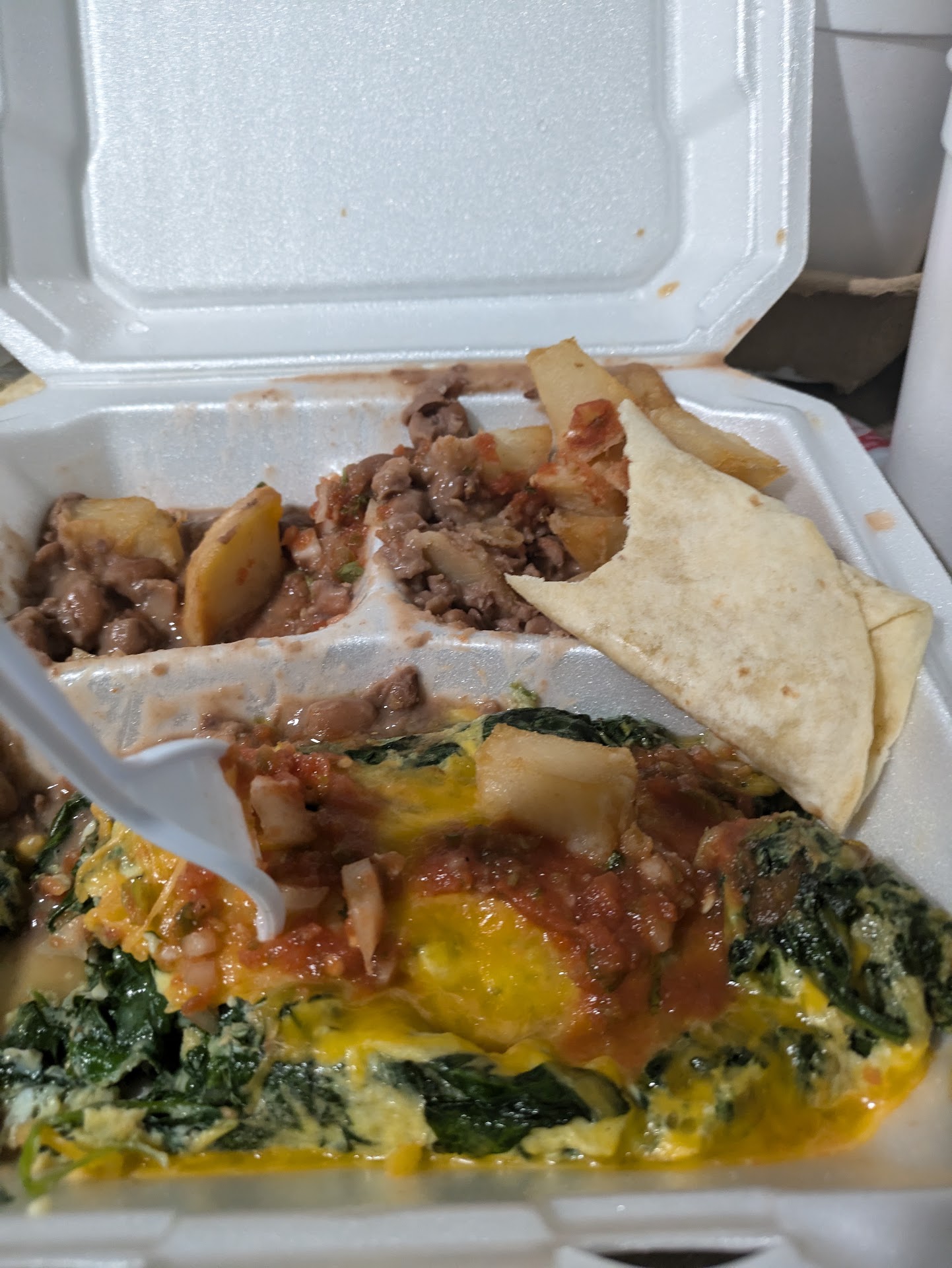 Read moreI arrived at 6:40 AM. Our trusted Google maps info matched the hours on the door Open: 6:30, yet the door was locked. A gentleman looked up from the Kitchen as if to say oops, time got away from me. He quickly made his way to the door and opened with a friendly Ola. He quickly went to the back to pour me a cup of coffee while the other person I'll call "Kitchen Lady" and I looked over the menu. She says if I order the breakfast burritos I'll need 3 or 4 due to their size. Omlette sounded good so I asked if they could make a Spanish Omlette even though it wasn't in the menu. See Senior, anything you want. Spanish Omlette it is -- OR SO I thought. When the to go box arrived kitchen Lady opened the box with a flare and a "see", I was introduced to the prettiest and what I would soon find out -- the best Spinatch Omlette I have ever tasted. Yes, you read right, I said Spinatch, not Spanish --oops. The language barrier however worked to my advantage this time. I'm glad I decided to pass by the Cafe Brazil on my way to the new, best experience with a Spinatch Omlette I've ever had compliments of the Bishop Arts District. Meal complete with potatoes , Refried beans, corn or flour tortillas, and homemade Salsa. Wheel Chair accessible but not automatic. Handicapped parking is hard to find. El Jordan was. Real find for this lover of Mexican food. I hope to return for lunch or dinner one day. Great job. Friendly attitude and cooking skills more than made up for the mild...